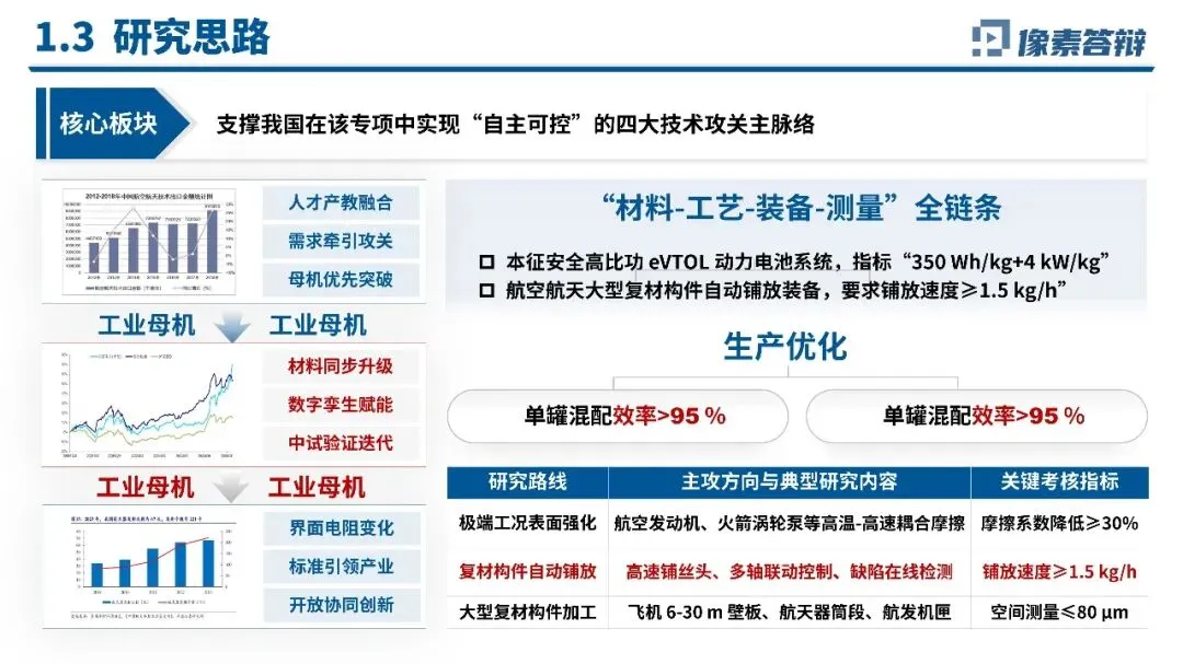 项目立项紧扣国家重大需求,2025年起我国低轨星座组网、可回收火箭产能爬坡带来装备需求激增,而航空航天领域高端装备、核心材料、精密传感器等均被国外垄断,形成多个技术盲区与产业短板。研究思路以“需求牵引、母机优先”为核心,确立四大攻关主脉络,构建“材料-工艺-装备-测量”全链条研究体系,针对极端工况表面强化、复材构件自动铺放等方向设定明确考核指标,同时结合人才产教融合、中试验证迭代等方式,形成从技术攻关到产业落地的完整路径,精准对接国家专项自主可控要求。