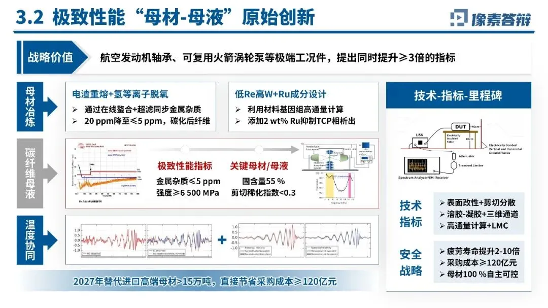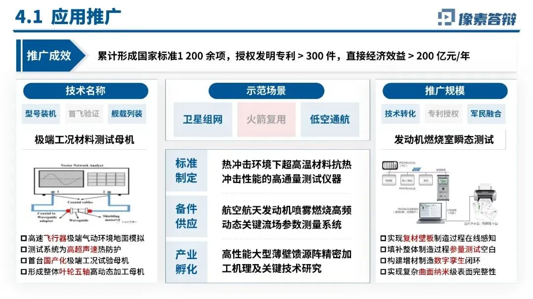 项目将研究问题拆解为“科学问题-技术难题-工程指标”三级任务包,聚焦T1000级碳纤维、eVTOL动力电池、超精密机床等关键瓶颈,设定金属杂质≤5ppm、电池能量密度350Wh/kg等核心指标。创新点集中在三大方向:超精密极端工况母机颠覆创新,使精度、频率等指标提升2-10倍;极致性能母材原始创新,实现100%自主可控并大幅降低采购成本;数字孪生-智能运维系统级创新,推动运维范式从“事后维修”向“预测-自优化”跃迁。应用推广上,项目累计形成国标1200余项、发明专利超300件,落地于卫星组网、火箭复用、低空通航等场景,经济社会效益显著,年直接经济效益超200亿元,带动超10万个高质量就业岗位,故障率、碳排放强度均大幅下降。
