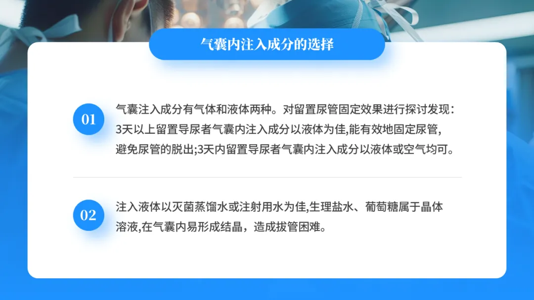 气囊注入成分有气体和液体两种。对留置尿管固定效果进行探讨发现:3天以上留置导尿者气囊内注入成分以液体为佳,能有效地固定尿管,避免尿管的脱出;3天内留置导尿者气囊内注入成分以液体或空气均可。