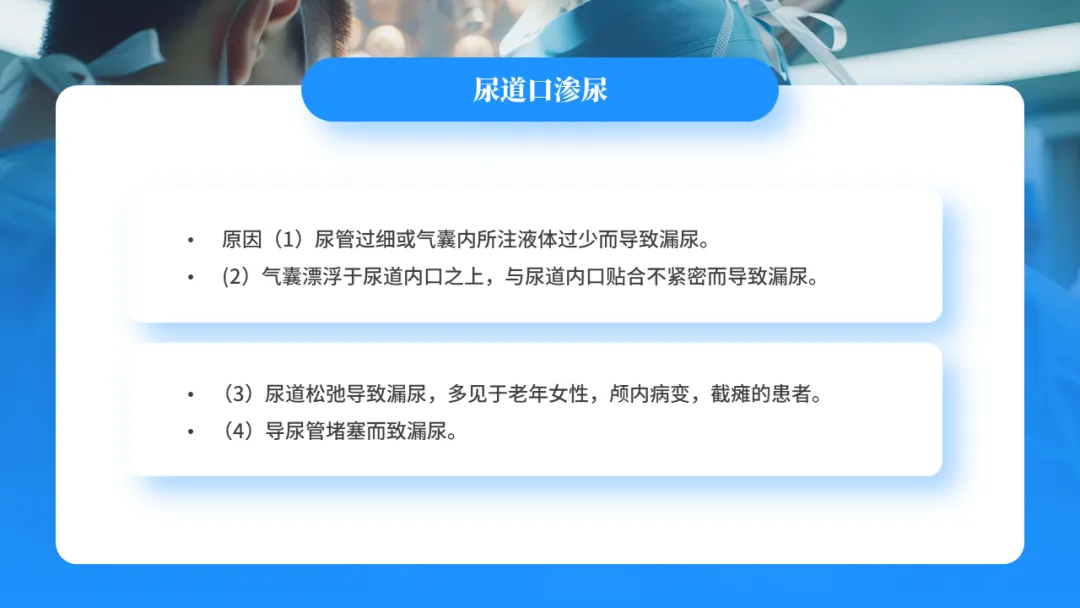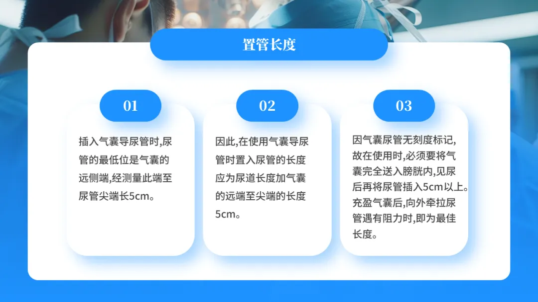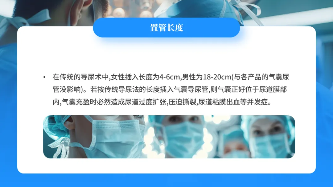 在传统的导尿术中,女性插入长度为4-6cm,男性为18-20cm(与各产品的气囊尿管没影响)。若按传统导尿法的长度插入气囊导尿管,则气囊正好位于尿道膜部内,气囊充盈时必然造成尿道过度扩张,压迫撕裂,尿道粘膜出血等并发症。