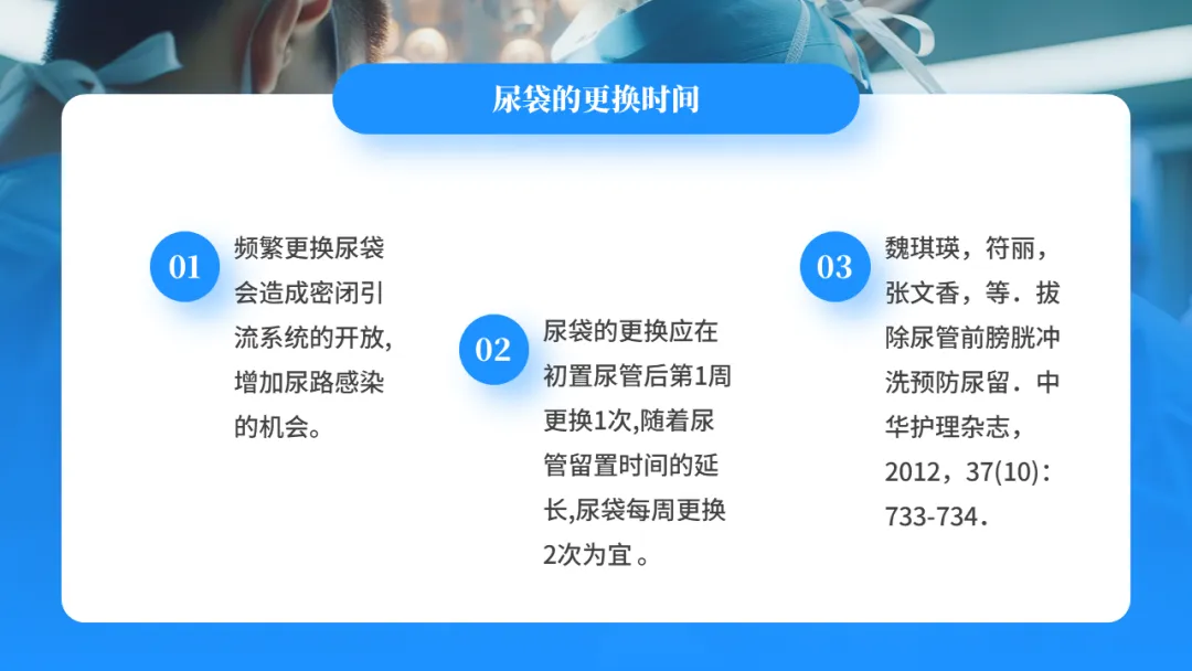 尿袋的更换应在初置尿管后第1周更换1次,随着尿管留置时间的延长,尿袋每周更换2次为宜 。
