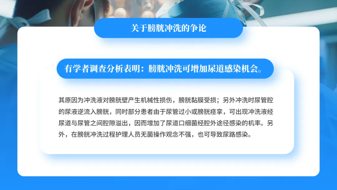 有学者调查分析表明:膀胱冲洗可增加尿道感染机会。