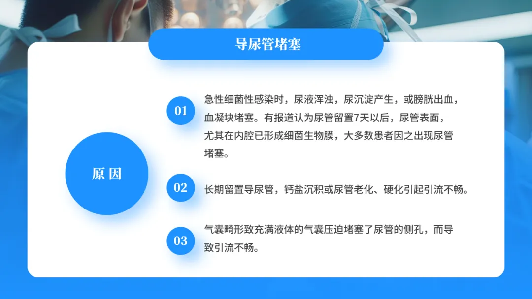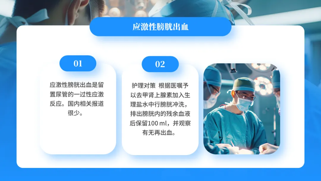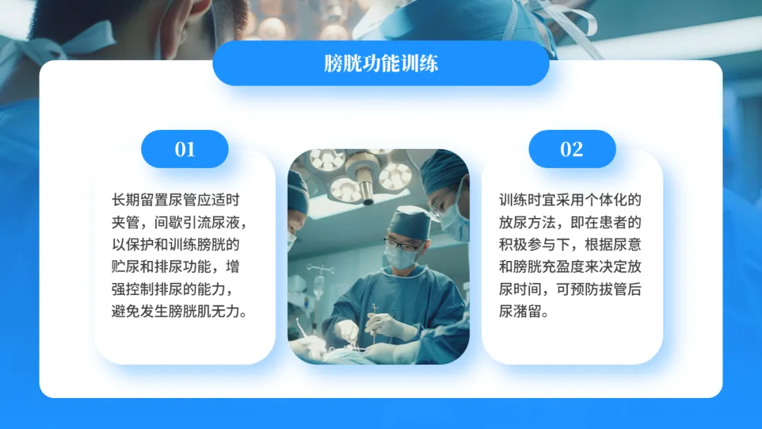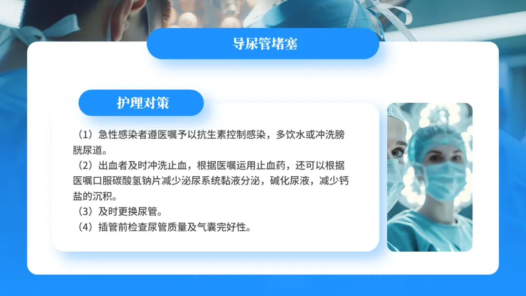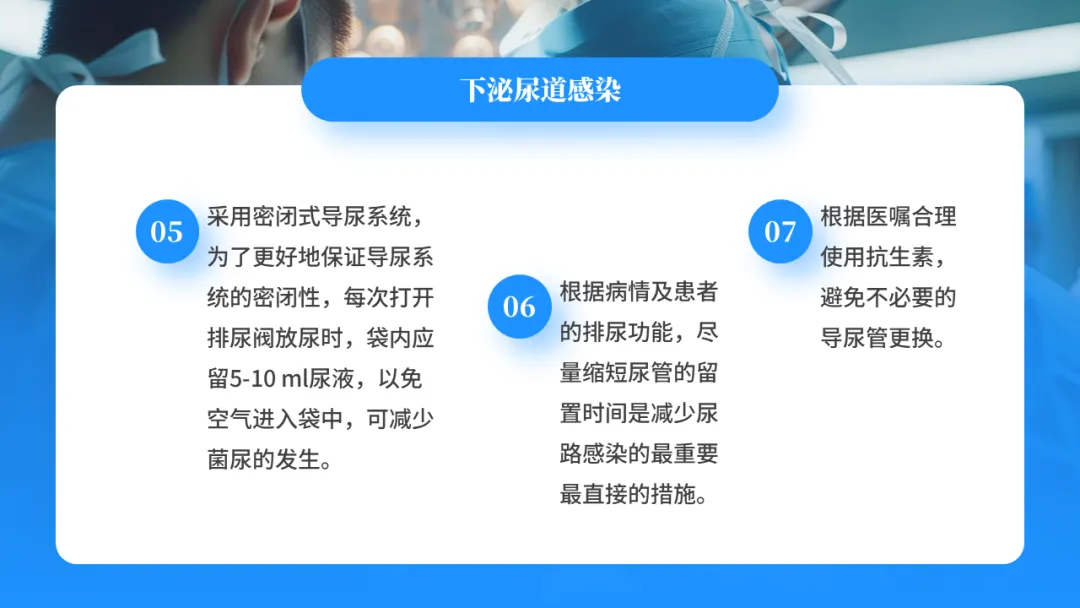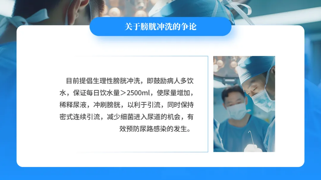 目前提倡生理性膀胱冲洗,即鼓励病人多饮水,保证每日饮水量>2500ml,使尿量增加,稀释尿液,冲刷膀胱,以利于引流,同时保持密式连续引流,减少细菌进入尿道的机会,有效预防尿路感染的发生。