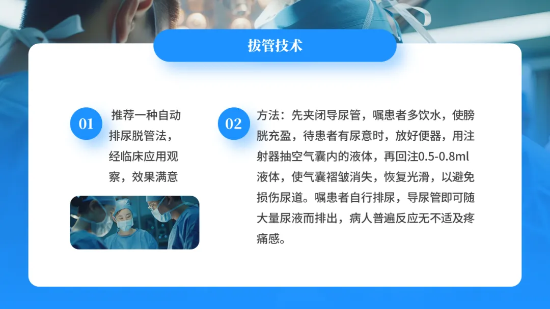 方法二:在手术前先麻醉后导尿,以取得无痛效果,手术室实施无痛导尿更能有效地保证无菌操作及保护患者隐私,缓解紧张心理,充分体现了以人为本的人性化服务宗旨。