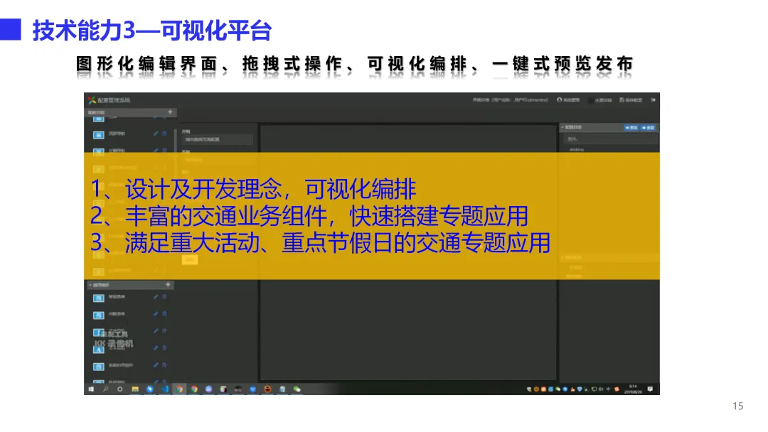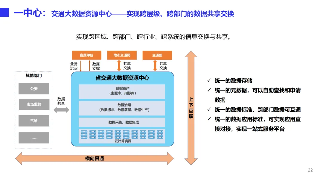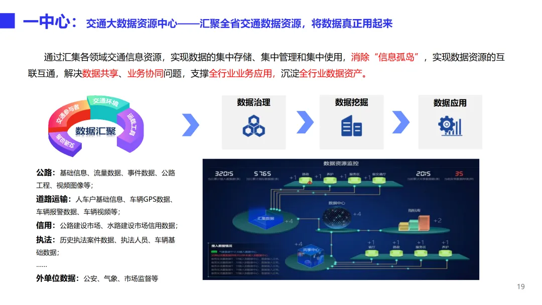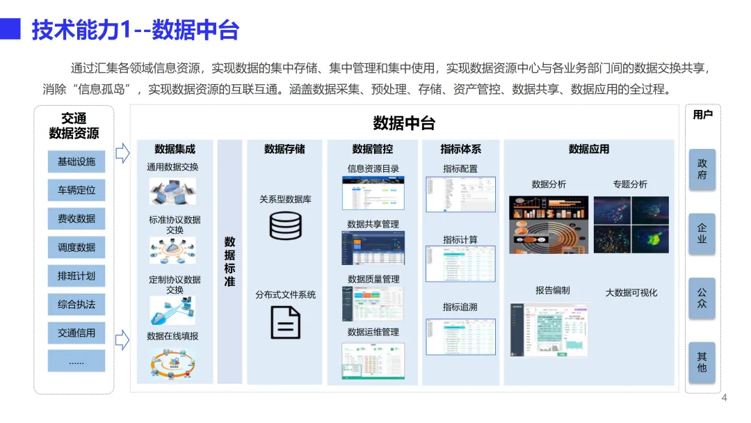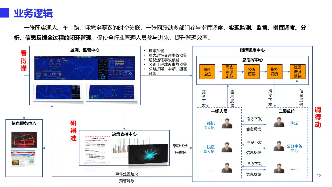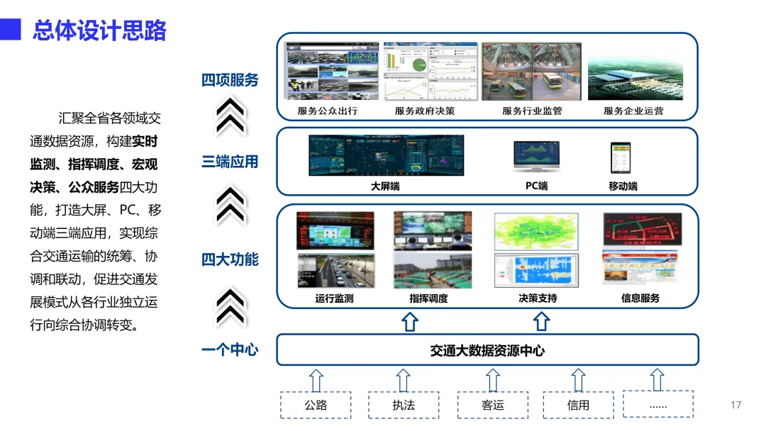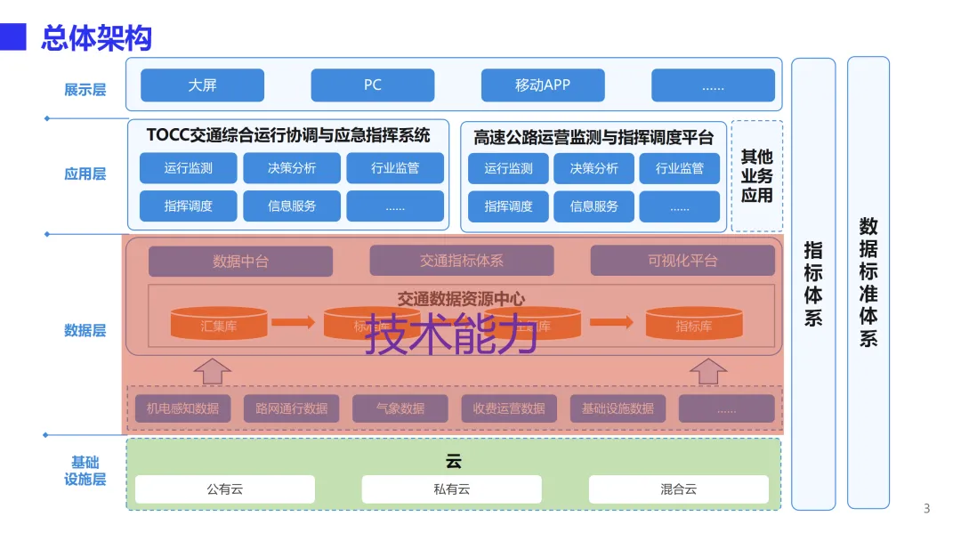 本方案是一套面向省级交通运行协调与园区智慧化运营的综合管理体系,旨在通过数据驱动实现综合交通运输的统筹协调和物流园区的数字化转型。方案以交通大数据资源中心为核心,构建“一个中心、四大功能、三端应用”的总体架构。一个中心即交通大数据资源中心,汇聚公路、道路运输、执法、气象等多源数据,通过数据中台实现采集、治理、存储、共享全流程管理,消除信息孤岛。四大功能包括综合交通运行监测、指挥调度、决策支持和信息服务,实现从日常监测预警、事件联动处置到宏观分析报告、公众出行服务的全链条闭环。三端应用覆盖大屏、PC和移动端,满足管理者随时随地掌握交通态势、处理业务的需求。在技术能力层面,方案构建了完善的交通指标体系与计算模型,支持路网拥堵分析、危货运输风险识别、节假日出行特征挖掘等深度应用,并建立统一的数据标准与质量管控体系,保障数据资产的长效运营。可视化平台提供拖拽式编排与丰富业务组件,可快速搭建各类专题应用。智慧物流园解决方案聚焦“物流业务在线化、管理服务平台化、园区基础智能化”三大方向,实现运单全流程追踪、自助进出区、仓储管理、中央收费、智慧通行、物业服务、资产管理等业务在线协同,并集成视频监控、设备告警、AR鹰眼、3D-BIM数字孪生等智能化手段,提升园区运营效率与安全管控水平。方案已在北京TOCC、广州白云物流园、深福保智慧园区等多个项目中落地验证,形成可复制的标杆实践。