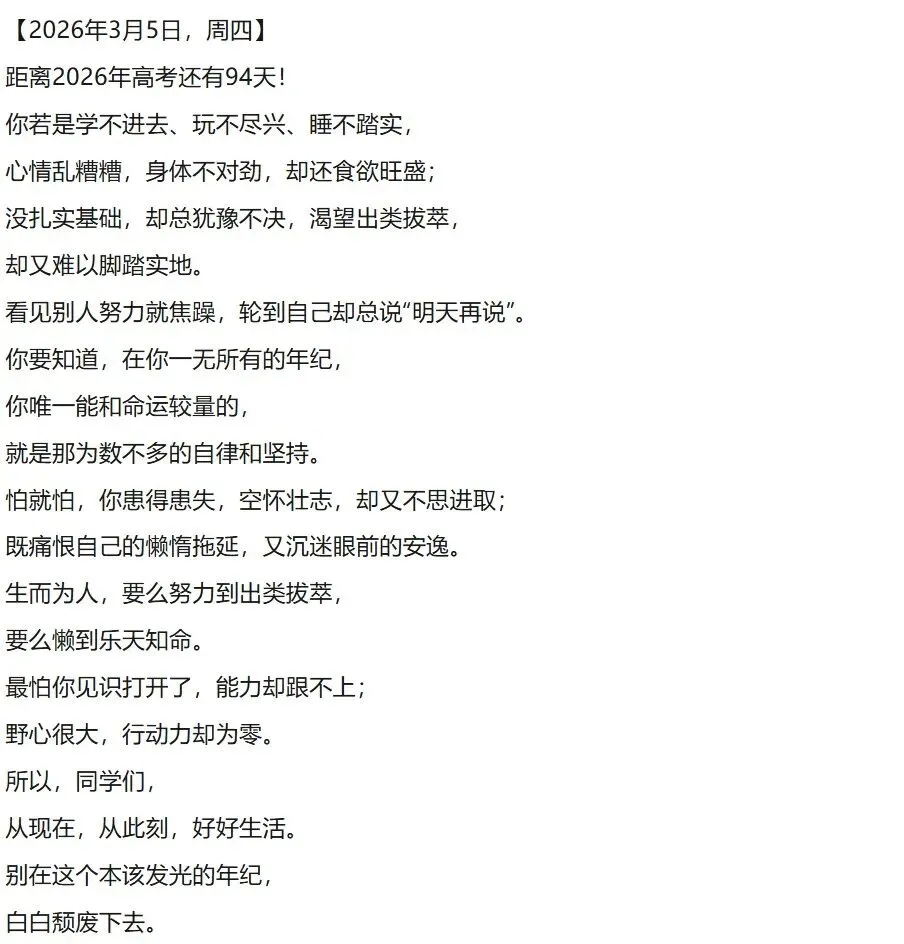 距离2026年高考还有96天! 人生就是这样,苦和累你总得选一样吧,那有什么好事都让你一个人占了呢?