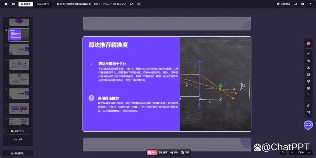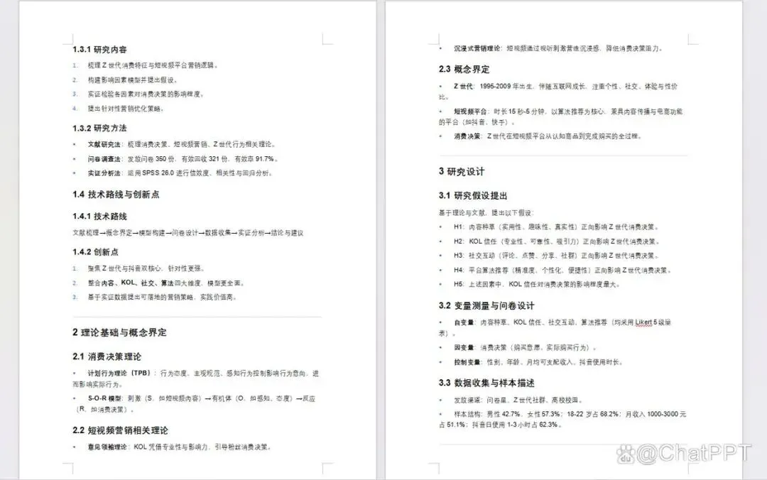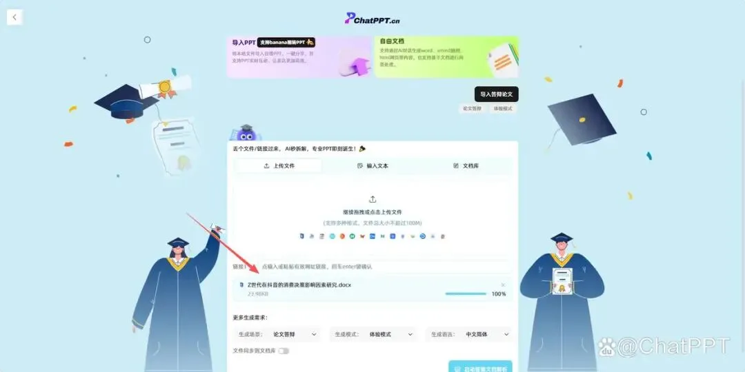 接下来,我们以一份“Z世代在抖音的消费决策影响因素研究”的本科毕业论文样例(AI生成)为例,详细拆解ChatPPT一键生成答辩PPT的实操步骤,全程简单易懂,只需三步就能完成。