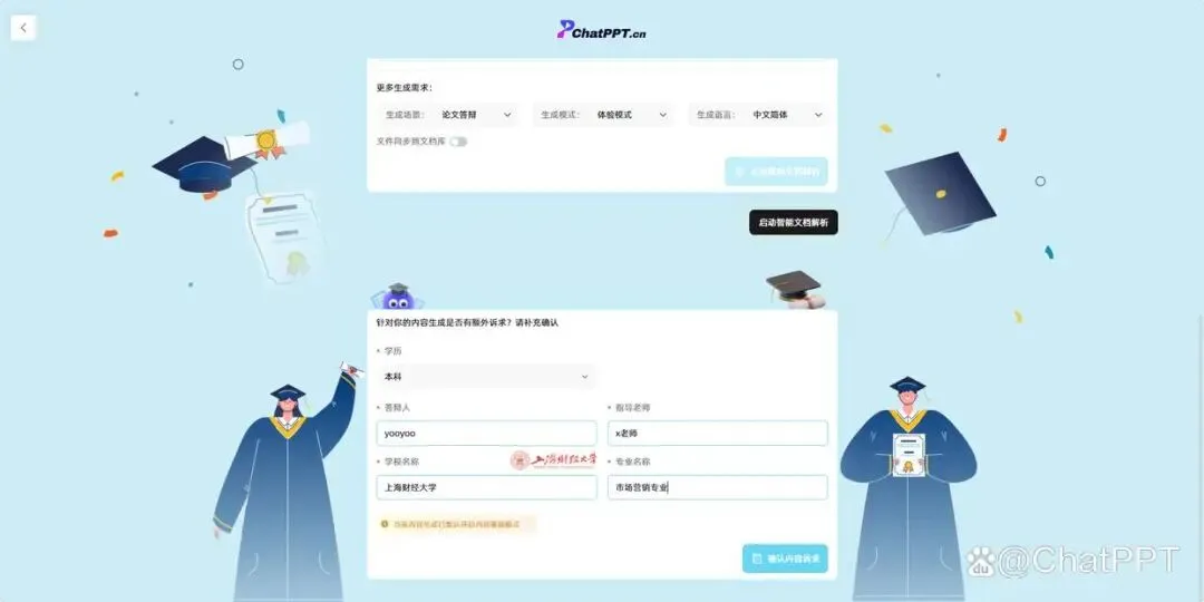 进入【论文生成PPT】界面后,有两种生成方式:一是直接上传Word或PDF格式的论文原文档,二是输入论文主题和核心想法。我们选择上传论文文档,同时补充填写答辩人、学校、专业、指导老师等基础信息,确认诉求后,点击启动智能文档解析。