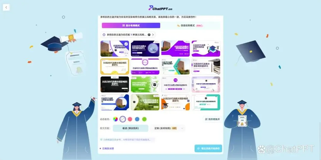 大纲确认无误后,就进入模板选择环节。模板的选择直接影响PPT的整体质感,俗话说“模板选得好,PPT质感差不了”,ChatPPT提供了多种适配学术答辩的模板,大家可根据论文的专业风格选择,兼顾简洁性与科研感。