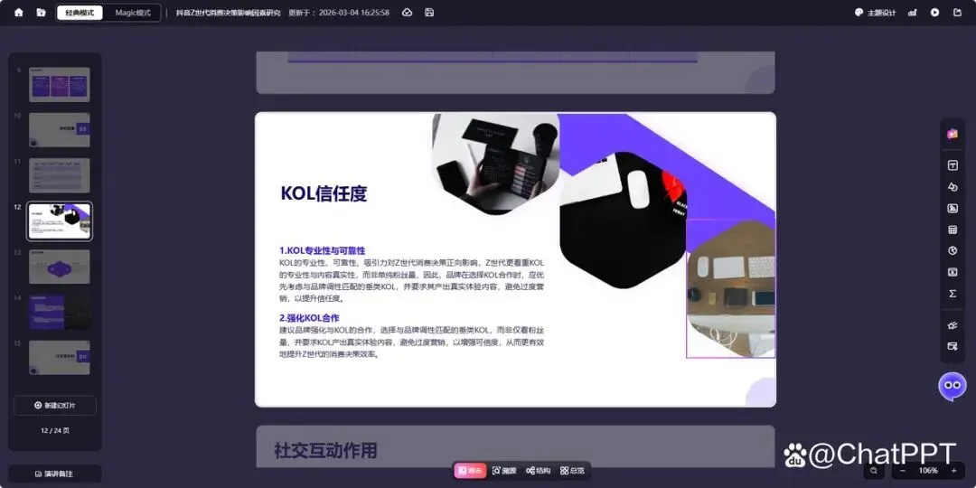 从生成的PPT来看,结构上完全贴合论文逻辑,涵盖了研究背景、研究方法、实证结果、讨论分析、结论建议等所有核心模块,页面排版整洁、重点突出。比如在“研究结果”页面,清晰呈现了KOL信任、算法推荐等因素对Z世代消费决策的影响,还补充了针对性的营销建议;“实证分析”页面则完整保留了论文中的信效度检验、相关性分析、回归分析等核心数据,甚至细化到具体的系数、显著性水平,以及各类理论的适配度评分。