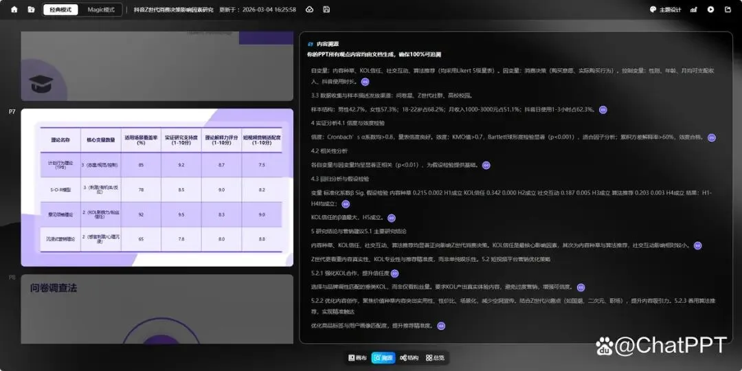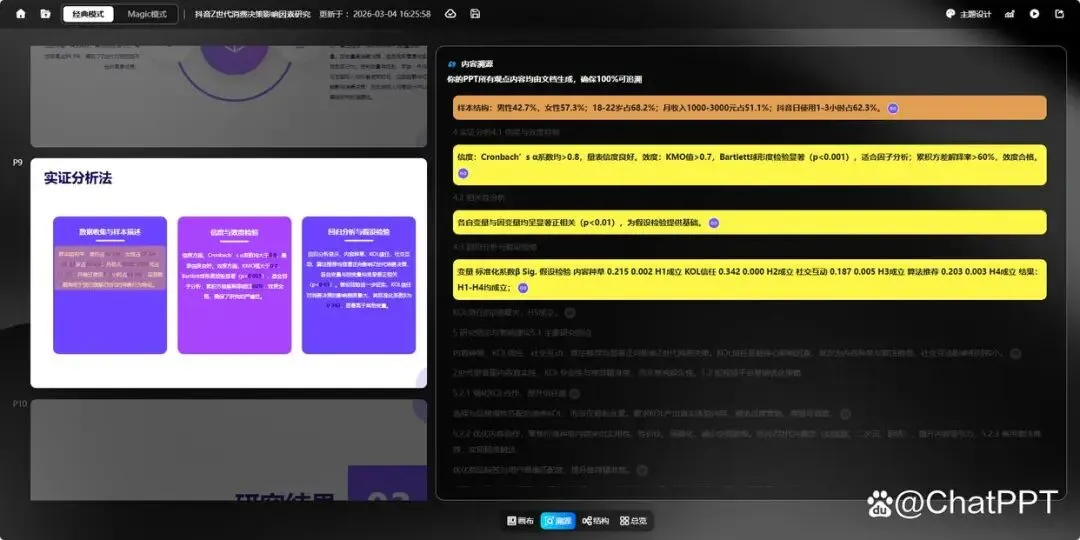 从测试效果来看,ChatPPT的“内容溯源”功能表现出色,论文中的所有数据、图表、核心观点都被完整引用,未出现遗漏或篡改的情况,就连问卷样本结构、量表类型等细节,也都准确呈现,完全符合学术答辩的严谨要求。