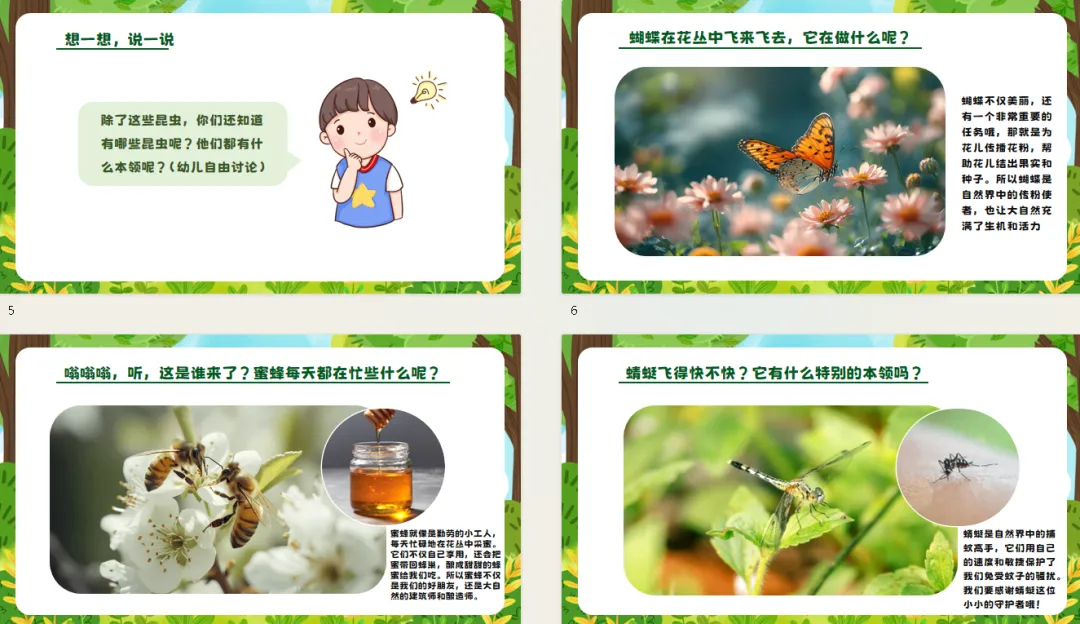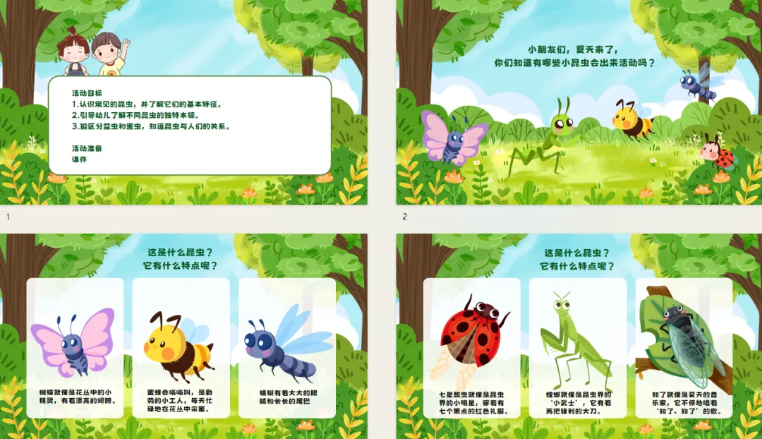 展示图片:教师逐一展示瓢虫、蝴蝶、蜜蜂、蜻蜓等昆虫的图片,每展示一张就问:“这是什么昆虫?它有什么特点呢?”
