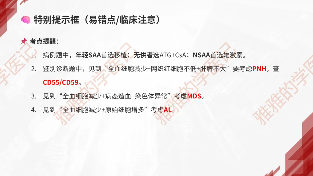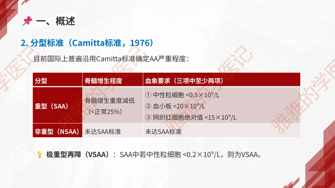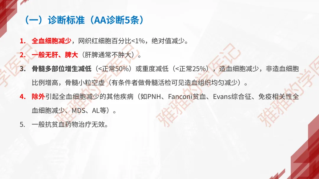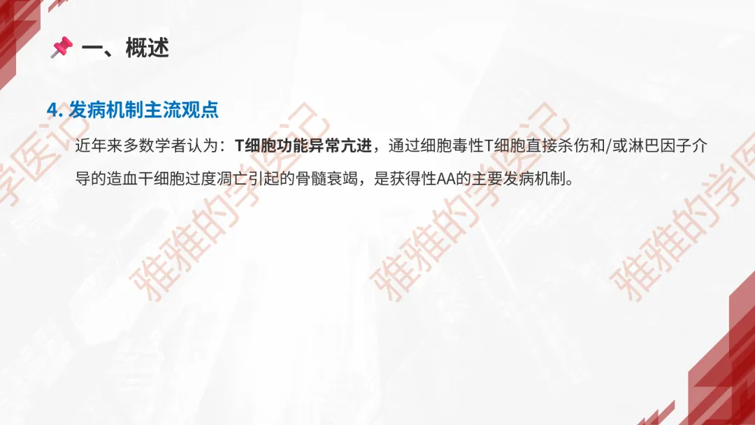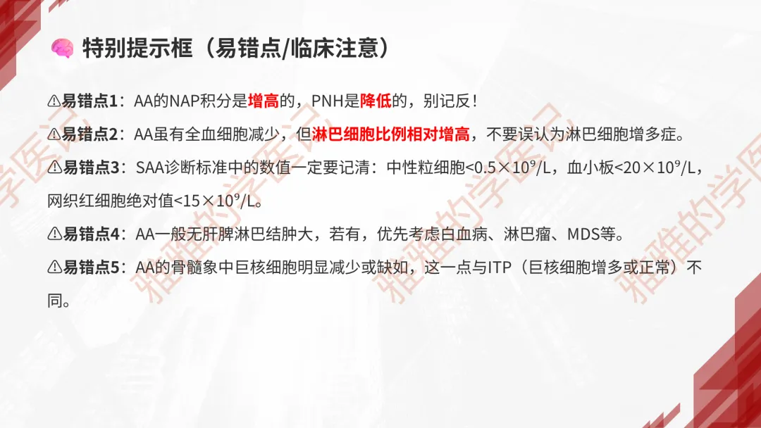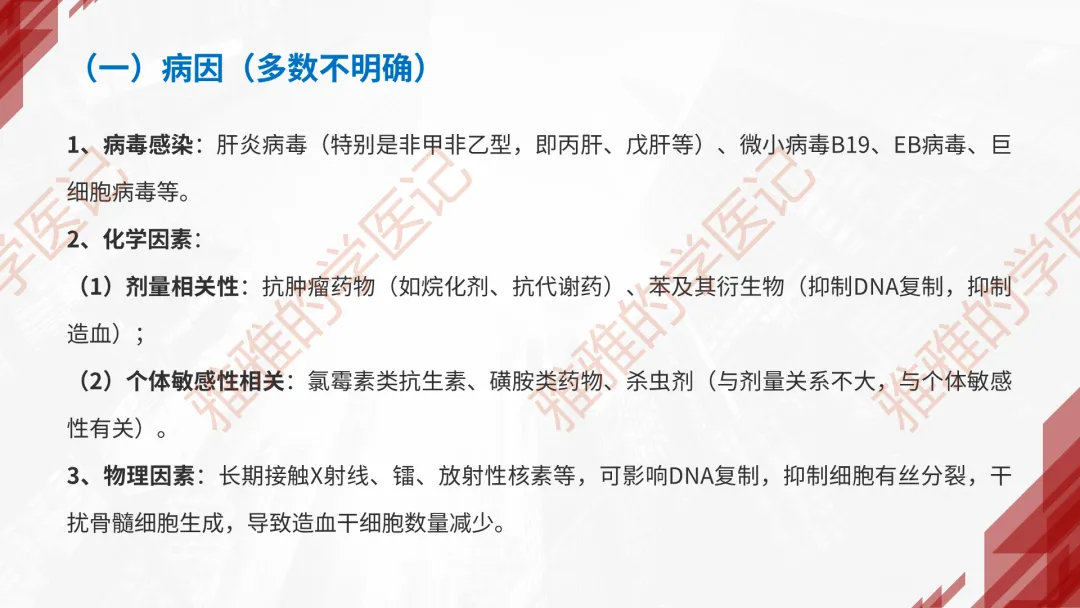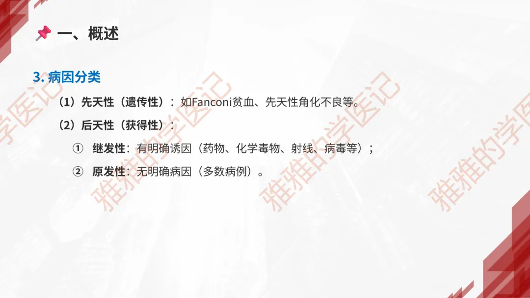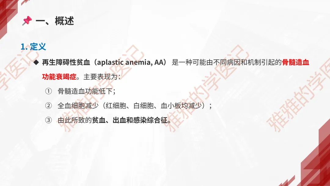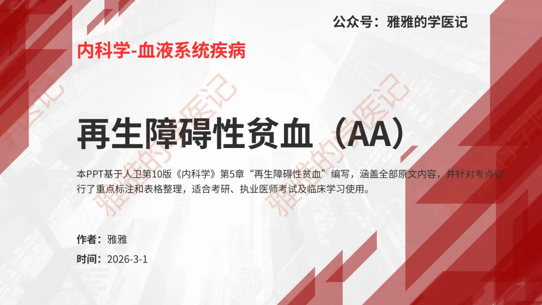 本PPT内容引用自《内科学(人卫第9、10版)》等权威文献,PPT版权归本公众号所有,制作与审稿均由小编独立完成。关注公众号为“雅雅的学医记”,获取更多专业健康知识。这份PPT凝聚了专业知识与临床经验,对再生障碍性贫血这一症状具有认识,并了解学习的意义,欢迎大家分享转发,共同学习,期待与大家的互动!目前学识有限,欢迎大家的指正。📚 本文配套资料:【PPT预览版】+【考点整理】PDF已上传学习通课程【雅雅的学医记】,加入课程即可下载,方便对照学习。后续更新内容:再生障碍性贫血(AA)多维学习笔记。- 知识点,需要不断积累,并梳理整理为自己的。加油!书山有路勤为径,学海无涯苦作舟。(韩愈)