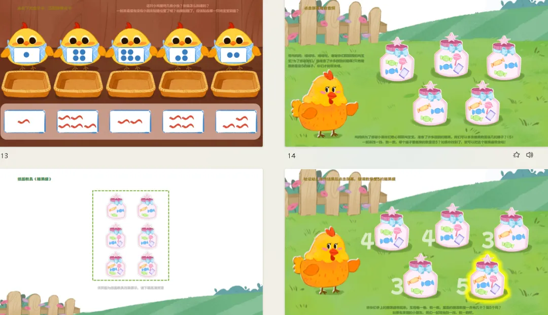 l纸面教具:《数数鸡宝宝》《喂小鸡》《糖果罐》。