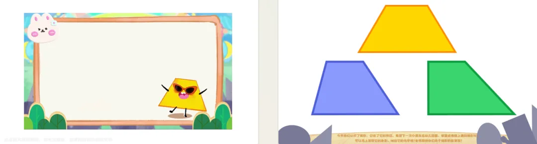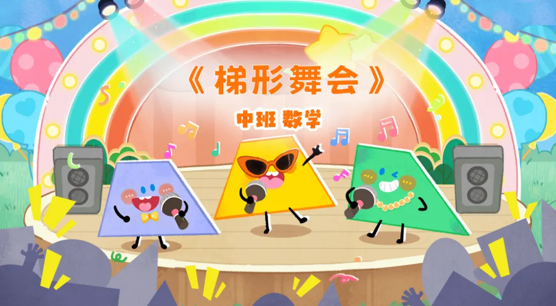 ——梯形家族的成员们就藏在舞会现场。请小朋友们找一找,把它们请到舞台上吧!