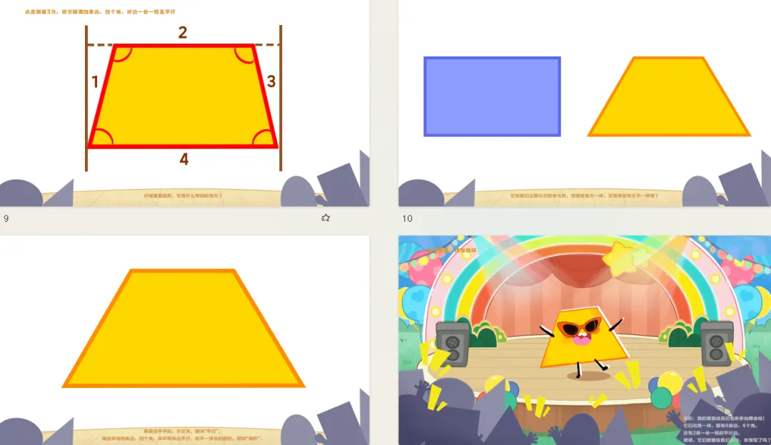 小结:这些梯形都有四条边、四个角,和一组一长一短的平行边。只要记住这个特征,不管梯形怎么“藏”,我们都能发现它!
