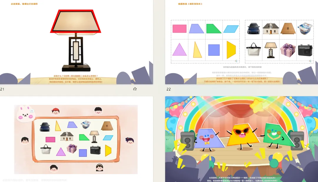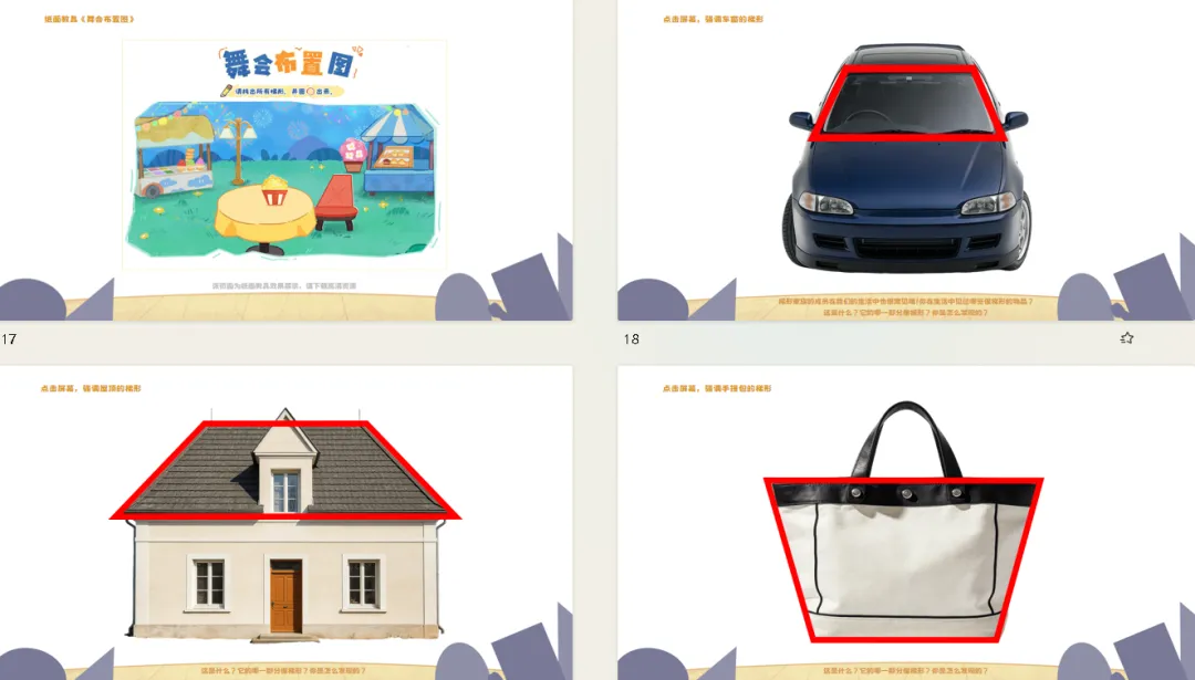 1.分发纸面教具,在舞会场景中,找出所有不同大小、方向、颜色的梯形。