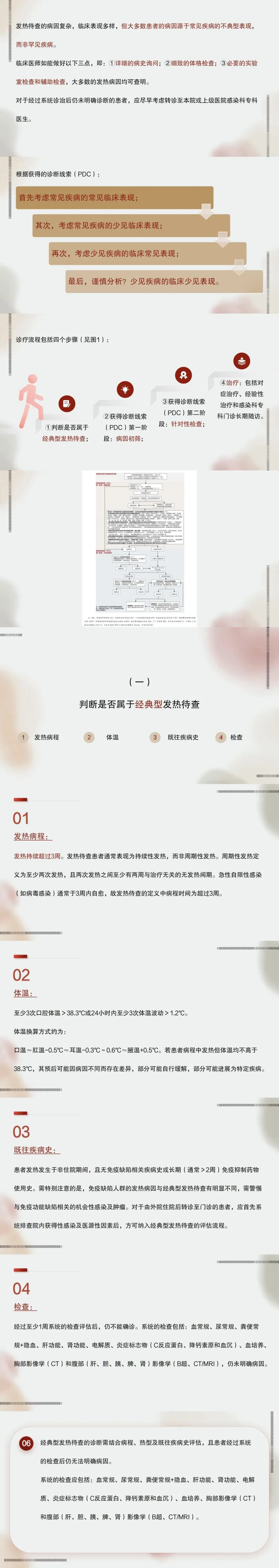 6.经典型发热待查的诊断需结合病程、热型及既往疾病史评估,且患者经过系统的检查后仍无法明确病因。