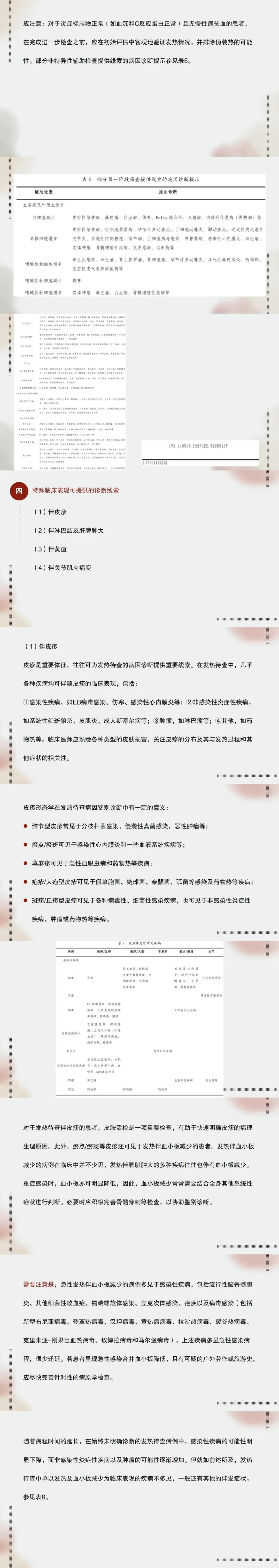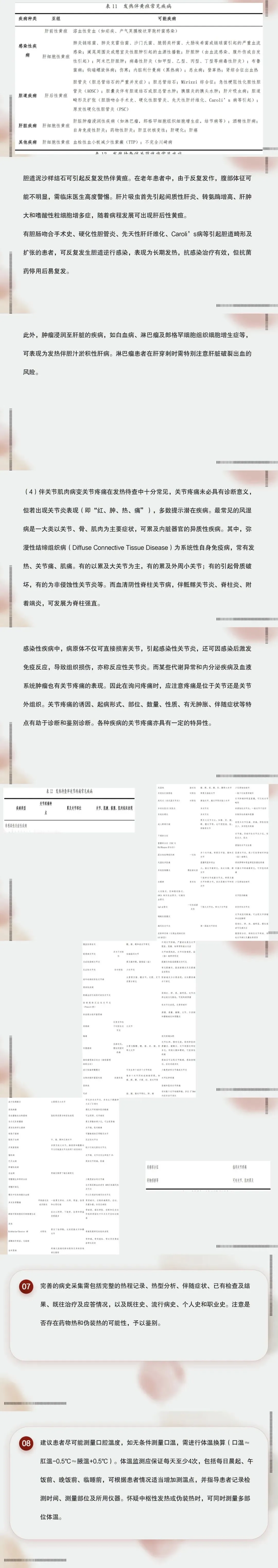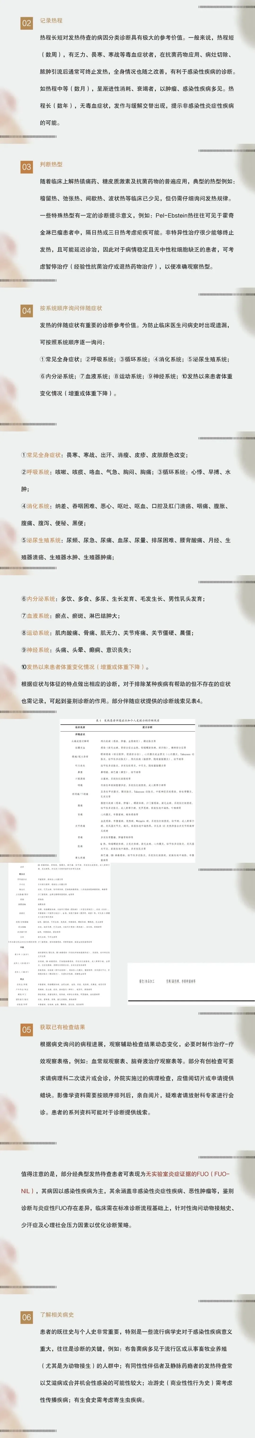 7.完善的病史采集需包括完整的热程记录、热型分析、伴随症状、已有检查及结果、既往治疗及应答情况,以及既往史、流行病史、个人史和职业史。注意是否存在药物热和伪装热的可能性,予以鉴别。