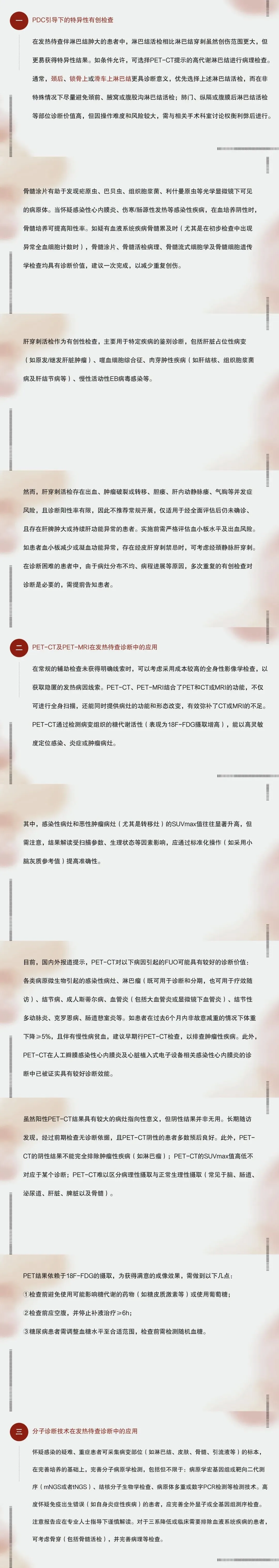 ④疑似肿瘤性发热的患者,推荐根据临床线索选择全身浅表淋巴结超声、头/胸/腹/盆腔CT或MRI等影像学检查,若初步筛查提示肿瘤可能,可进入第二阶段针对性检查(如骨髓穿刺和活检、皮肤或淋巴结活检等)。