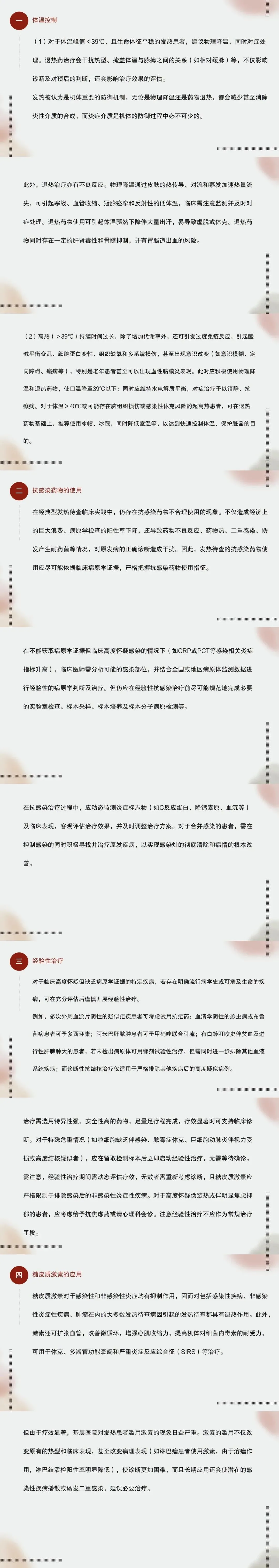 16.对于体温峰值<39℃、且生命体征平稳的发热患者,建议物理降温,同时对症处理。体温在39~40℃,应积极使用物理降温及退热药物使口温降至39℃以下;同时维持水电解质的平衡。体温>40℃,或可能有脑组织损伤或感染性休克风险的患者,可在退热药物的基础上,推荐使用冰帽、冰毯,同时降低室温等。