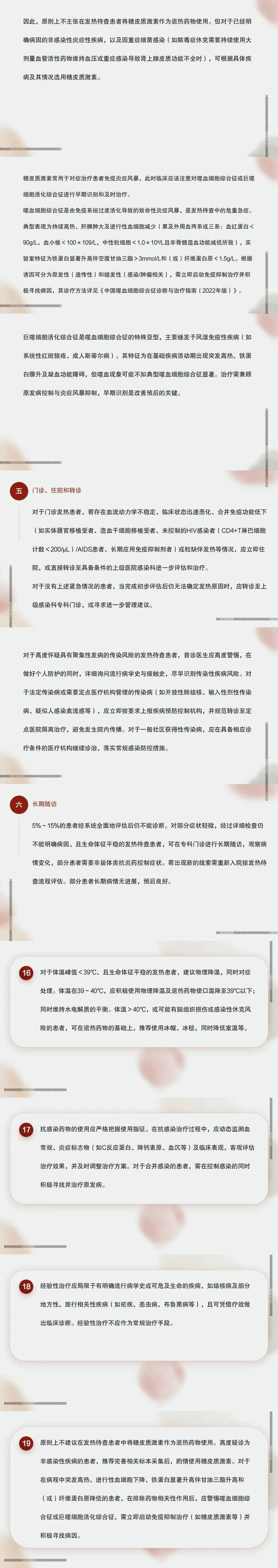 15.对于经过以上全面的检查仍未能明确诊断的发热待查患者,或因病情复杂危重、诊疗条件受限导致诊断困难时,建议及时转诊至上级医院感染科专科医生进一步评估。