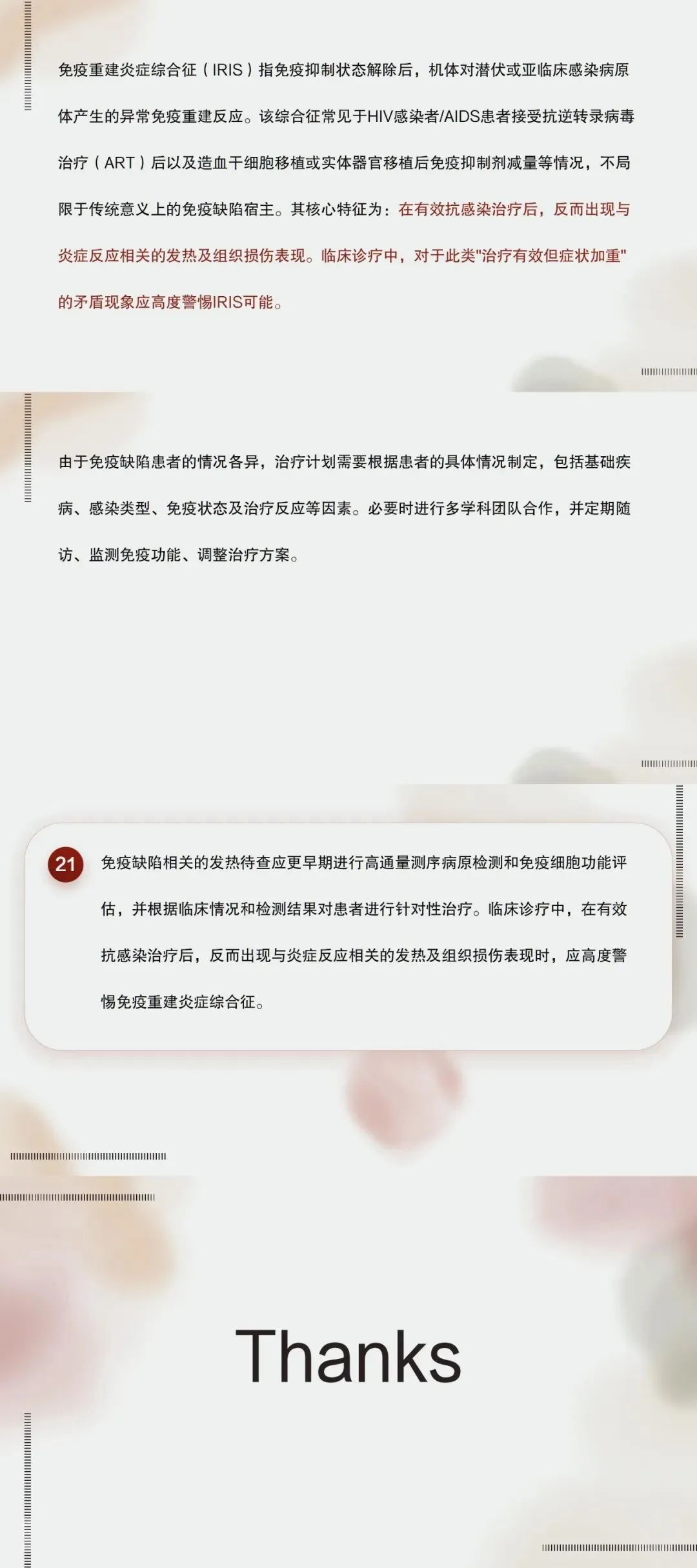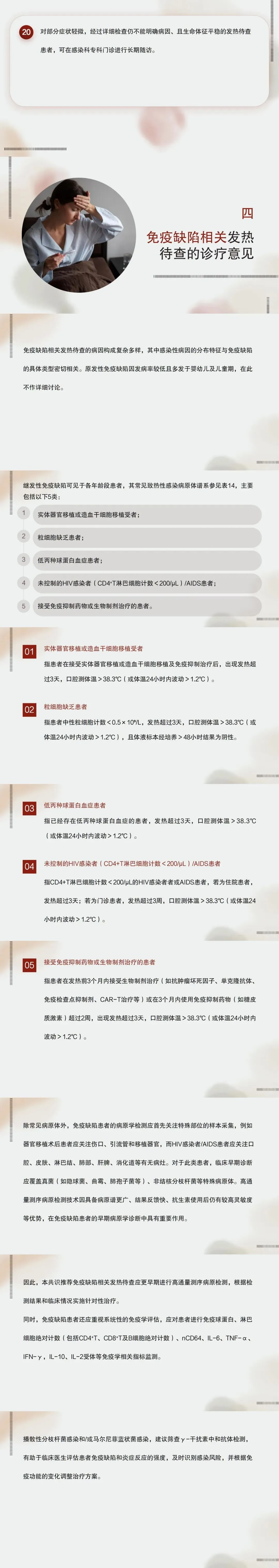 21.免疫缺陷相关的发热待查应更早期进行高通量测序病原检测和免疫细胞功能评估,并根据临床情况和检测结果对患者进行针对性治疗。临床诊疗中,在有效抗感染治疗后,反而出现与炎症反应相关的发热及组织损伤表现时,应高度警惕免疫重建炎症综合征。