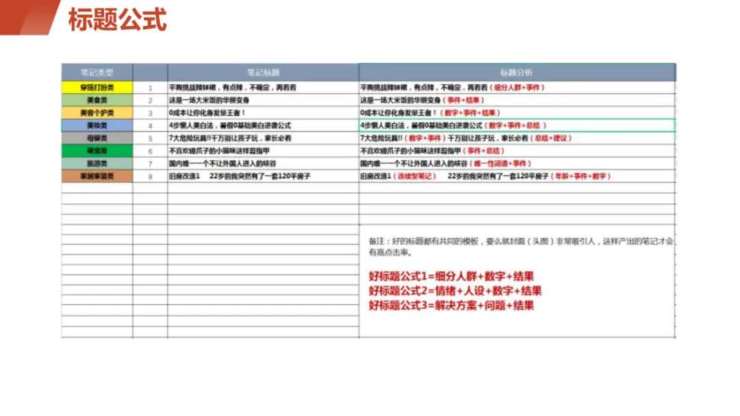 标题公式:根据笔记类型分为多种公式,如穿搭类是细分人群+件,美食类是事件+结果等,好标题公式包括细分人群+数字+结果等多种形式。