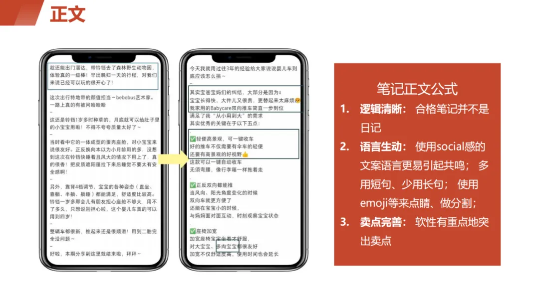 正文公式:逻辑清晰,语言生动(多用短句、emoji等),卖点完善且需注意过审秘籍,避免敏感词,合理调整语序和替换近义词。