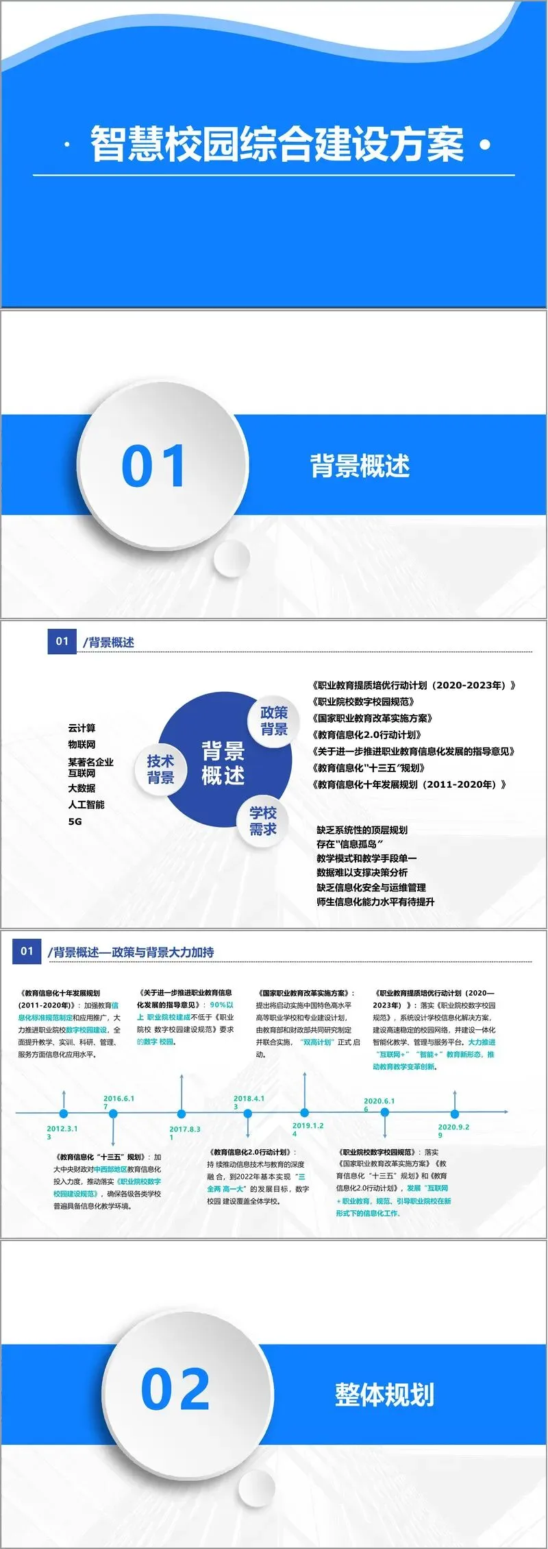 在背景概述部分,方案指出当前职业教育正迎来多重政策红利,包括《职业教育提质培优行动计划》《职业院校数字校园规范》《教育信息化2.0行动计划》等国家级文件,为智慧校园建设提供了强有力的政策支持。与此同时,学校在实际运行中仍面临诸多挑战,如信息孤岛现象普遍、教学模式单一、数据决策能力不足、师生信息素养有待提升等。技术层面,云计算、物联网、大数据、人工智能和5G等成熟技术的发展,为校园全面数字化奠定了坚实基础。