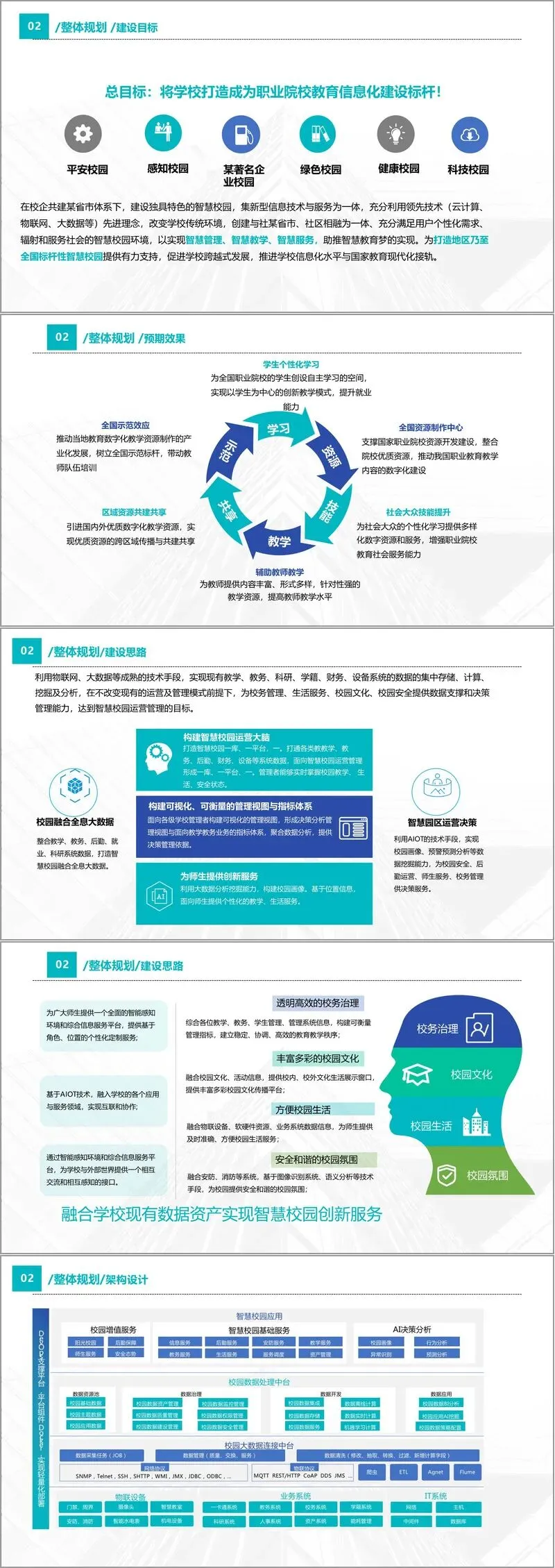 整体规划章节明确了建设目标:通过校企共建模式,构建一个融合新型信息技术与服务的智慧校园体系,实现从传统校园向感知化、互联化、智能化环境的转型。该体系不仅服务于校内师生,还将与社区、城市融合,形成辐射社会的教育服务能力。预期效果包括打造全国资源制作中心、推动区域资源共享、支持学生个性化学习、提升教师教学能力、增强社会培训服务能力等。