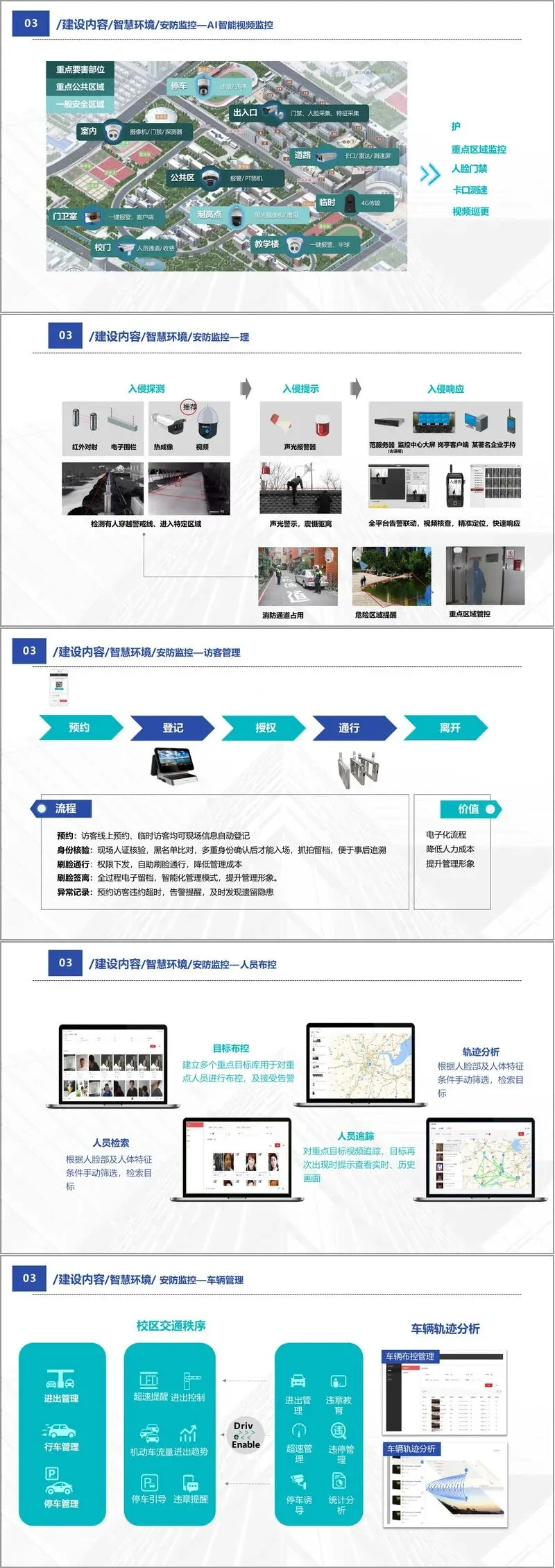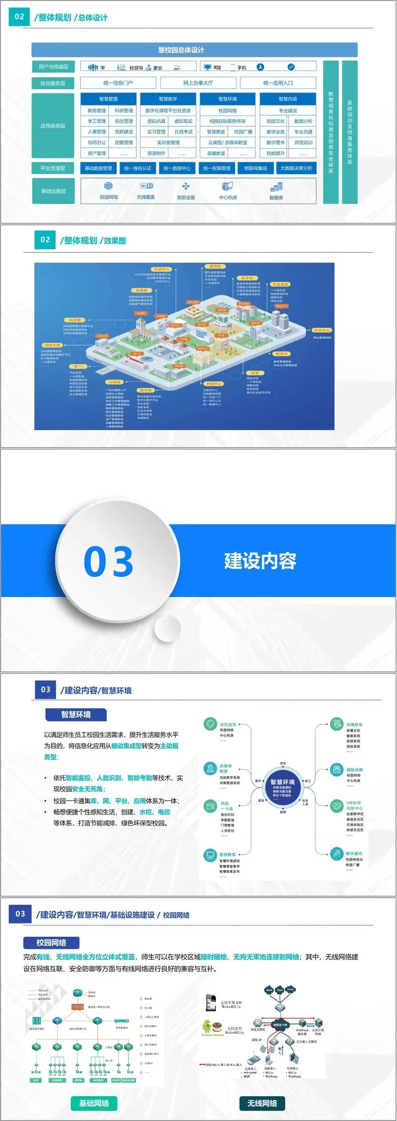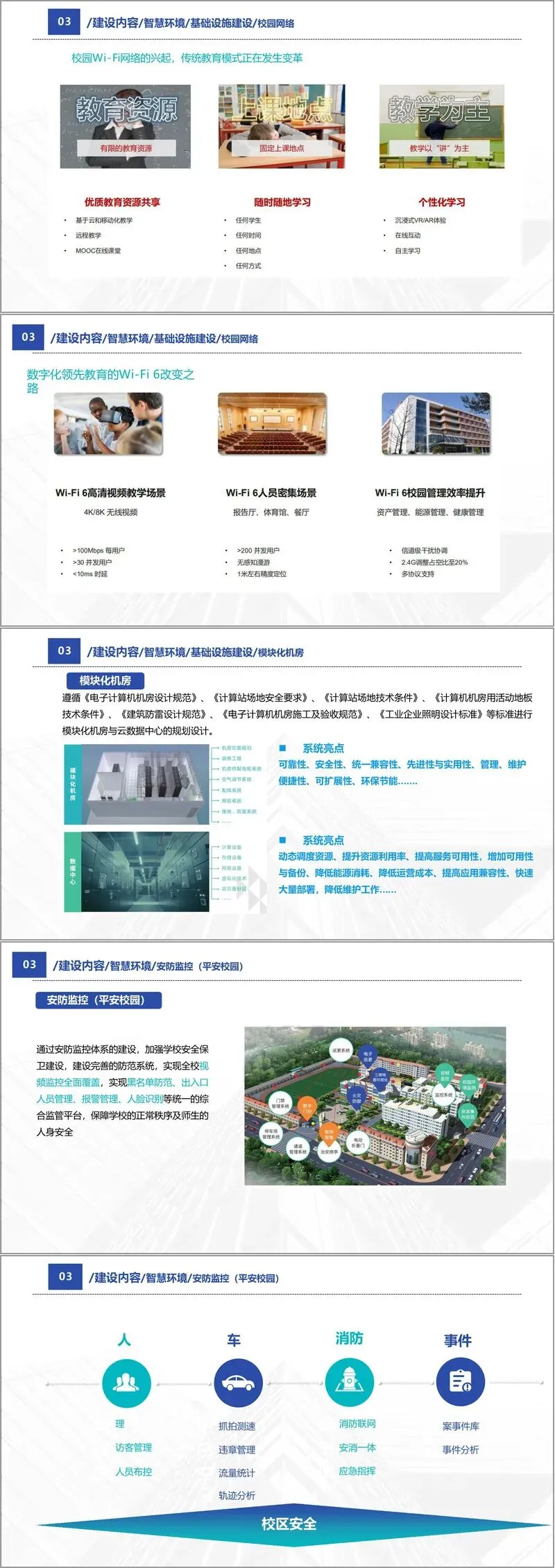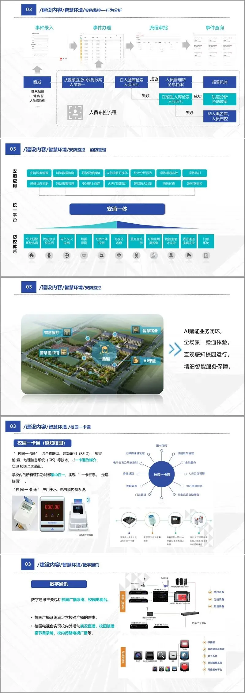 第一,智慧环境。包括基础设施建设,如全覆盖的有线无线网络、模块化机房、安防监控系统、人脸识别门禁、访客管理、车辆管理、消防联动等,旨在打造平安、感知、绿色、健康的校园环境。校园一卡通系统作为感知核心,整合身份识别、消费、水电控制等功能,实现“一卡走遍校园”。多媒体教室、录播教室、智慧教室等教学空间也将全面升级,支持互动教学与远程协作。