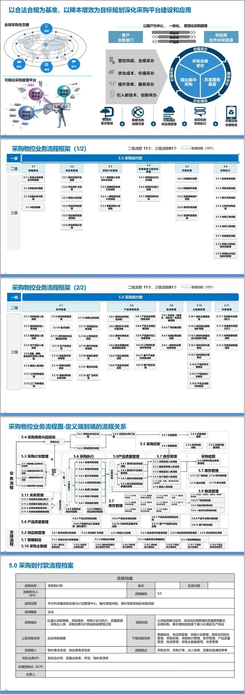 文件的核心部分在于对“采购到付款”端到端业务流程的细致梳理与架构设计。规划将整体业务划分为5个一级流程域、11个二级流程模块和多达81个三级具体流程,涵盖了从策略制定、供应商管理、采购计划、商务招投标、库存管理、质量管理到数据管理与关务管理的全链条活动。