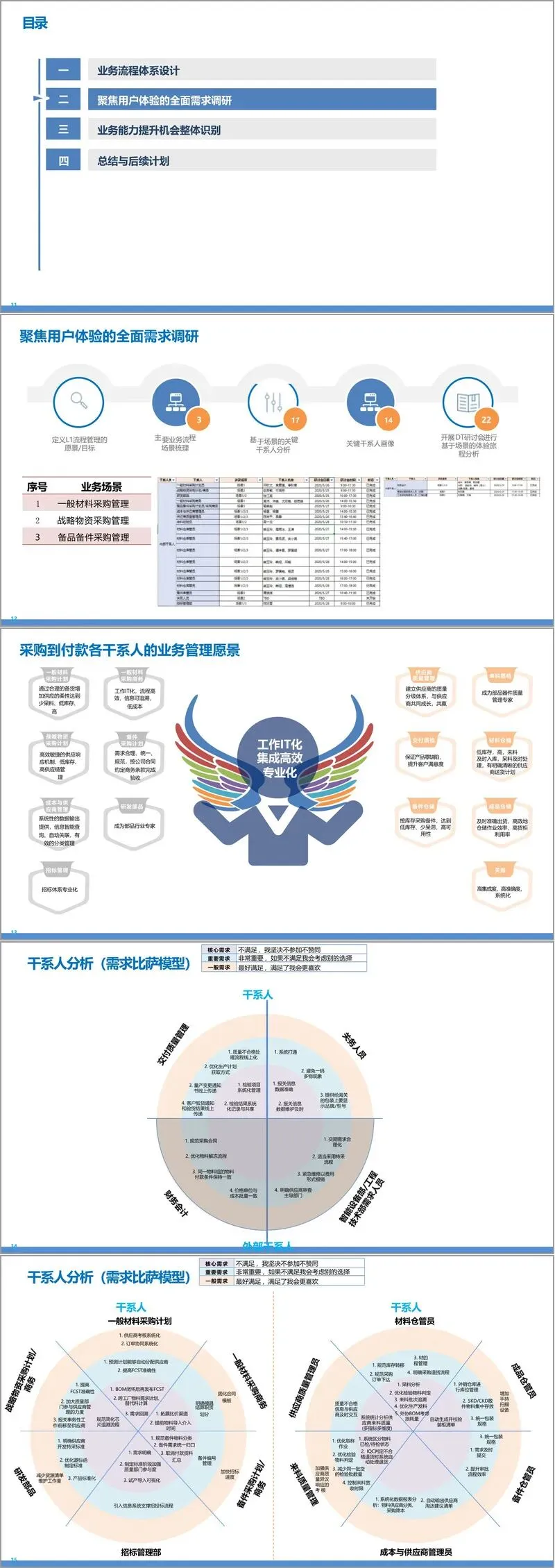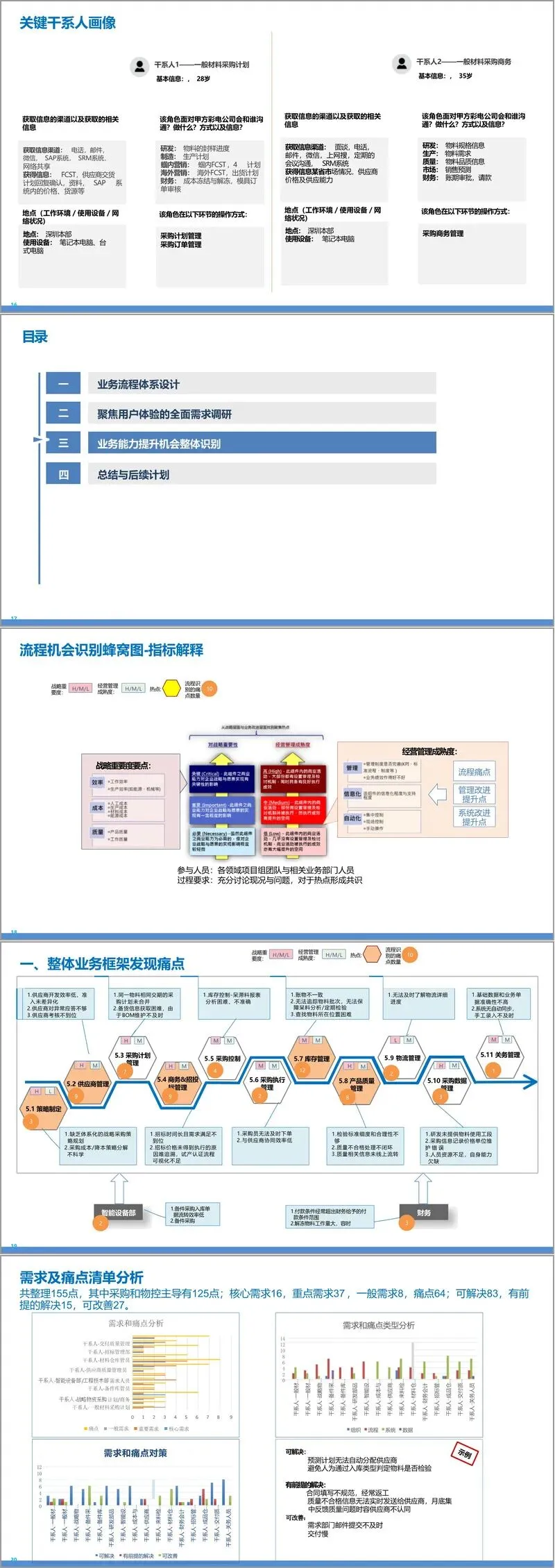 规划高度重视用户体验,采用了“干系人画像”和“体验旅程图”等工具进行了全面的需求调研。通过对采购计划员、采购商务、研发部品、仓管员、质检员、财务、关务等十四个关键角色的深入分析,精准刻画了他们的工作场景、信息交互方式、核心诉求与痛点。