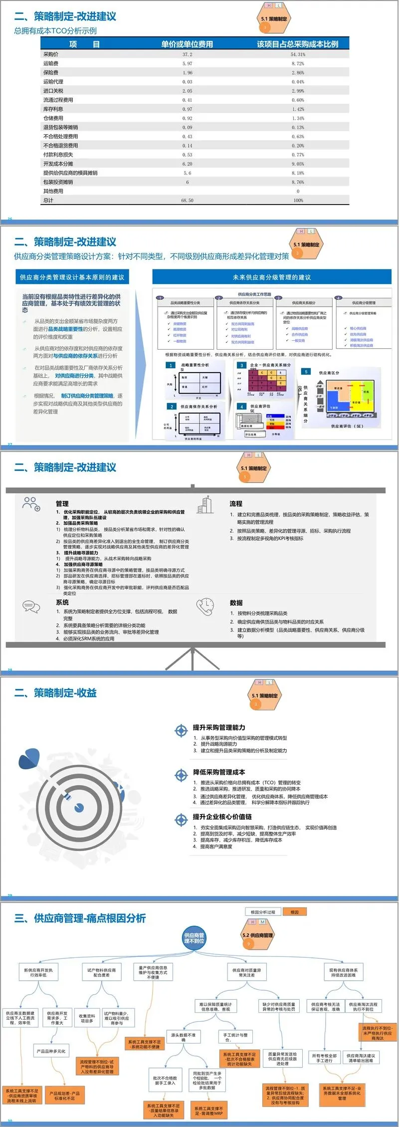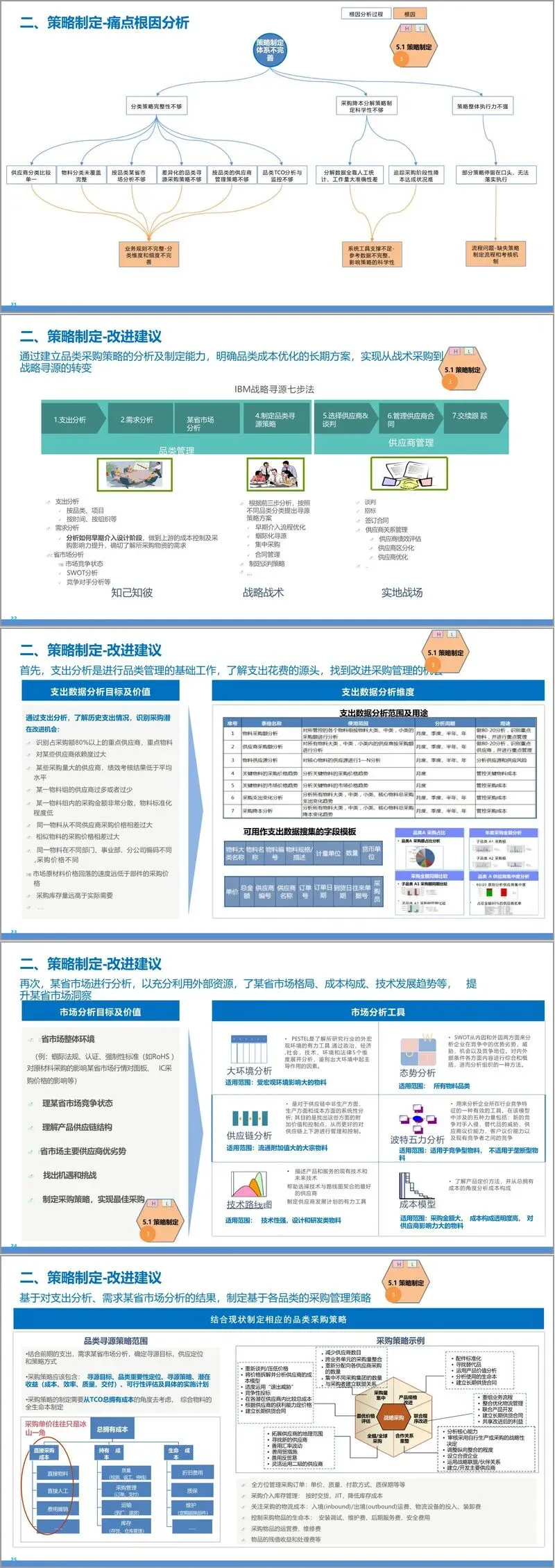 - 策略制定:强调从战术采购向战略寻源转型,引入品类管理理念,通过支出分析、需求分析和市场分析,制定基于总拥有成本的差异化采购策略。