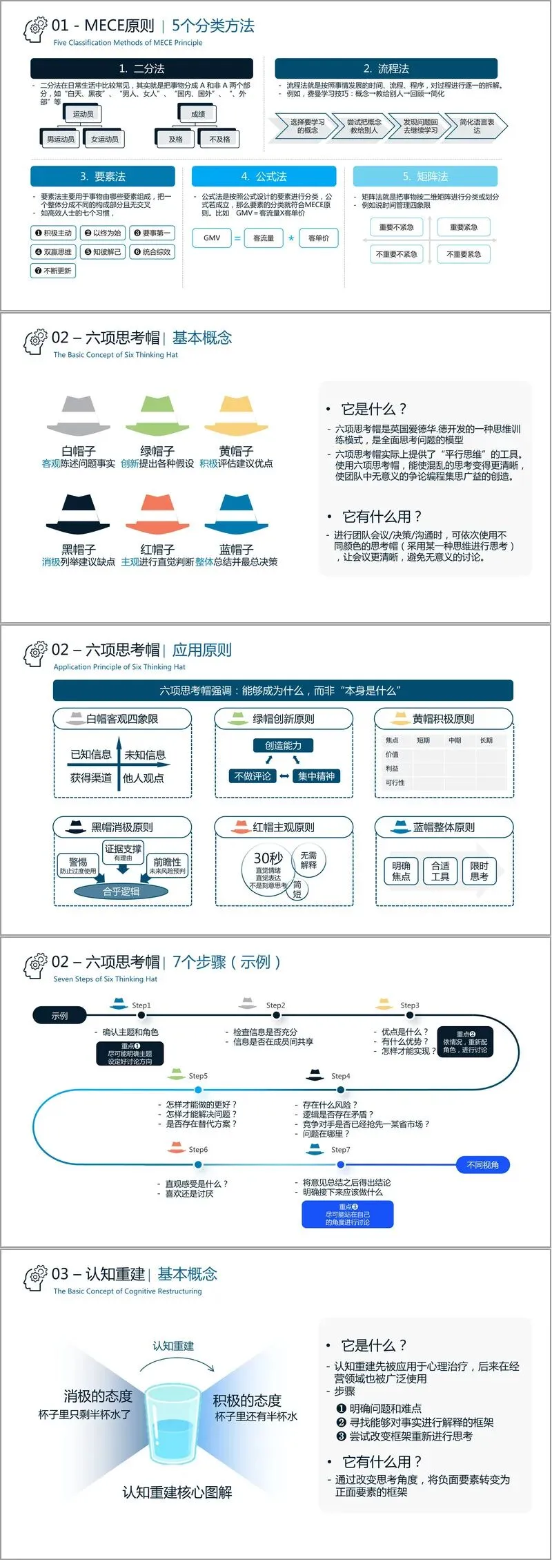 这些思维工具并非孤立存在,而是可根据实际场景灵活组合使用。无论是个人日常工作中的问题解决,还是企业战略制定、团队管理、市场拓展等复杂场景,都能从中找到适配的工具支撑,实现思维效率与决策质量的双重提升。