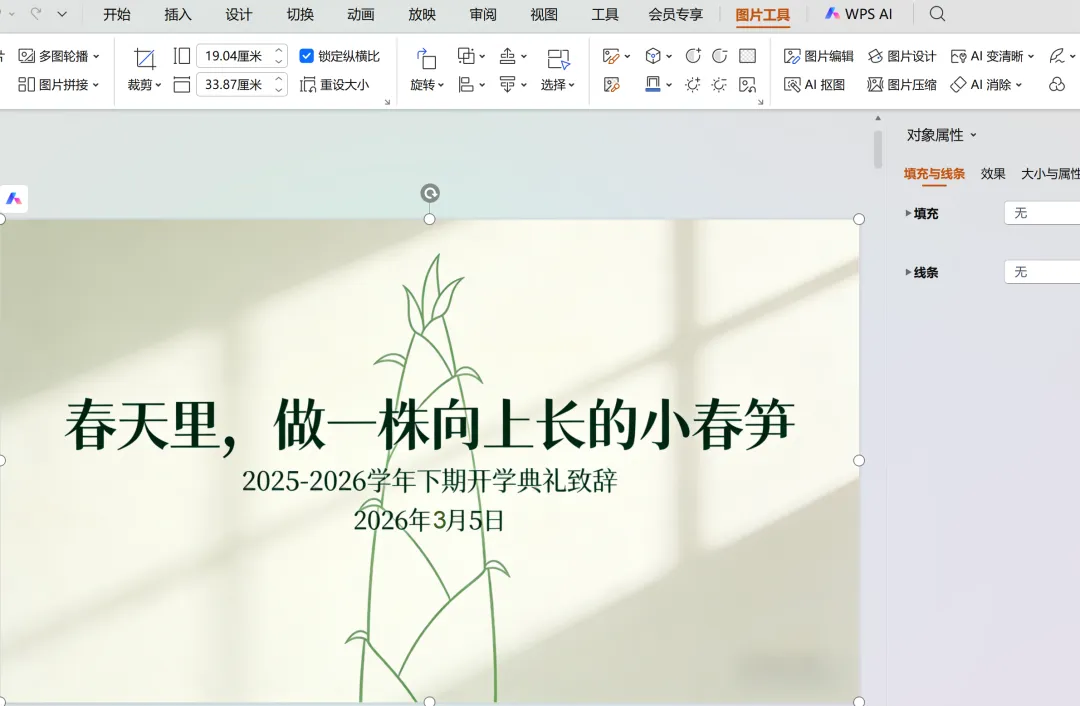 是不是满心期待等输出,结果全是空泛的套话,没有现场感、不贴合个人风格,更别说学生有收获、能听进去、有互动感了,改到最后还不如自己写,白忙活一场?教育部《教师生成式人工智能应用指引(第一版)》里,「AI辅助公文撰写」明明是助力校园管理升级的核心场景,可为啥到了很多场景,大家把AI用成了“鸡肋”?今天的开学典礼致辞,我总结了一套方法,用豆包写稿、用即梦AI生成图片,再用WPS整合成课件,用AI消除错别字,根据需要插入核心字词句。这样出来的文稿和课件,就有温度、有互动、落地性拉满,完全是“定制款”。今天就把这个落地方法分享给各位同行,5步实操,极简不费事,让我们告别模板化文稿,给孩子们真正的收获!用豆包语音丝滑对话,像和朋友聊天一样,就可以写出稿子。写稿先立题。好主题能让稿子活起来,与其自己硬憋,不如让AI先当“创意搭子”。明确抛出核心要求:核心教育主题+受众+场景+风格,让AI输出10个创意主题,再筛选,摒弃干巴巴的口号式主题。开学典礼3月5日,恰逢惊蛰和雷锋纪念日,要面向1-6年级孩子,我把要求抛给AI后,敲定了「春天里,做一株向上长的小春笋」这一主题。AI拆解:用春笋扎根、冒尖、抱团的成长意象,对应雷锋精神的坚持、担当、友善,孩子能理解、有画面感,还和春日开学典礼氛围完美契合,比单纯的“学雷锋做好少年”更有记忆点。核心技巧:要求越具体,AI的脑洞越精准,不绕弯、不模糊。校园讲话稿最忌“放之四海而皆准”的大话空话。校长的表达风格就是稿子的“个人标签”,想要AI不跑偏,喂参考素材是关键。我把自己上学期的两篇现场讲话稿发给AI,同时提炼出我的核心表达特点,明确要求复刻这种“不说教、重互动、贴生活”的风格,杜绝书面化、成人化表达。这样AI就能快速贴合自己的说话节奏,写出来的稿子读起来顺口,完全是自己的风格,不用再花大量时间调整和优化。AI初始输出的内容,难免会和校园实际不符,这一步就是精准纠偏,让内容落地。比如AI最初写“校园里的春笋冒尖”,但校园里没有竹林,我立刻告诉AI,把场景改成“小区看到的春笋”,再加入“惊蛰”“雷锋纪念日”两个节点,让开篇从真实出发,瞬间拉近距离,没有一点违和感。核心技巧:发现问题直接语音,提出具体修改要求,让稿子和真实场景无缝衔接。最后一步就是碎片化抠细节,让每一句话都贴合现场表达。针对空泛、不流畅、不具体、不精准的地方,逐段打磨既高效,让稿子的每一个细节都合心意。普通AI做课件,容易模板化、缺乏意境,只适合做普通教学页。但开学典礼这类演讲型课件,核心不是信息,是情绪、画面和感染力。我用即梦AI的Agent模式,把文字、要求发给它,AI就能精准理解意境,让孩子听演讲、看画面,一眼就懂文字背后的意思,深度共情。我的提示词:写实+大片感+高级意境画面干净、有电影质感、16:9适配PPT,视觉冲击力强。生成后一键下载图片,直接复制粘贴到WPS PPT页面。逐页检查,用自带的AI消除功能,消除错别字、消除冗余图标。最后,在PPT对应页面添加核心字词或提纲,与配图、演讲内容呼应,让课件逻辑更清晰,确保课件更精准、更精致。这套方法可以在很多校园场景中套用,实现真正的提质增效。只有我们找对方法、用对工具,才能让生成式AI真正扎根场景,既省时间又出质量,这才是科技赋能教育管理的真正意义。END
