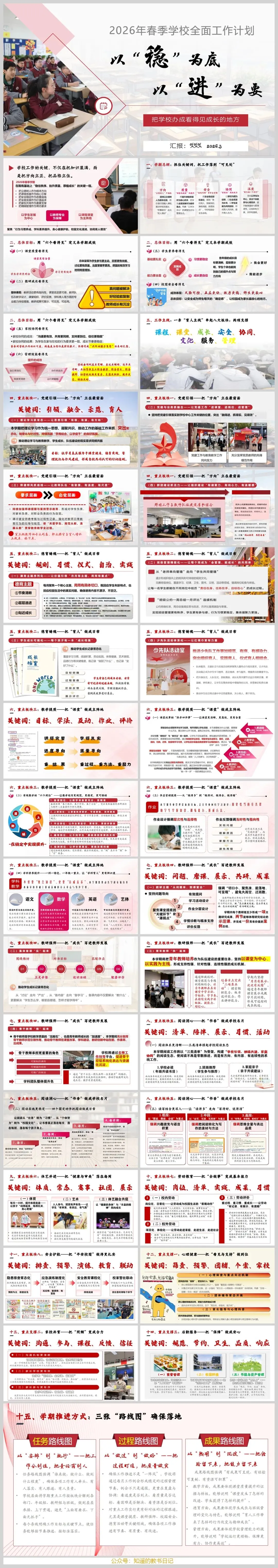 学校新鲜出炉的2026年春季学期中小学学校全面工作计划PPT,以“稳”为底,以“进”为要,核心目标是“把学校办成看得见成长的地方”。它围绕一条“育人主线”,系统规划了党建引领、德育铸魂、教学提质、教研强师、阅读润心、体艺并进、劳动教育、安全护航八大工作板块,并辅以心理健康、家校共育、后勤服务三项重要支撑,构建了本学期工作的完整框架。🏛️