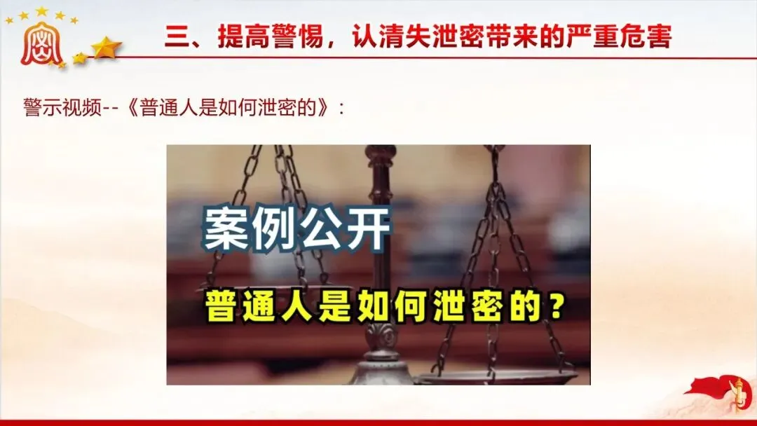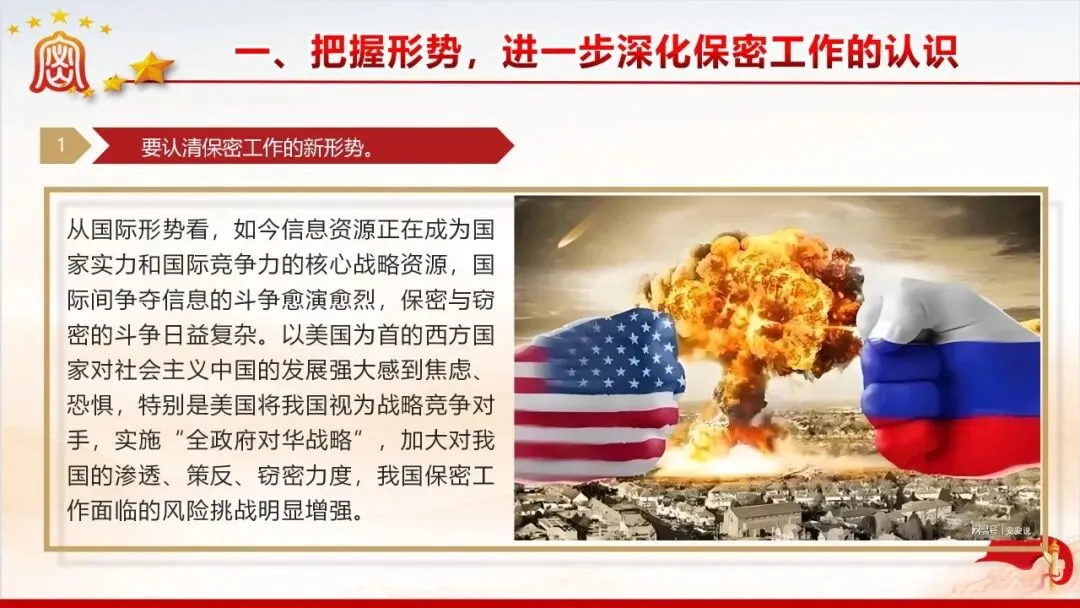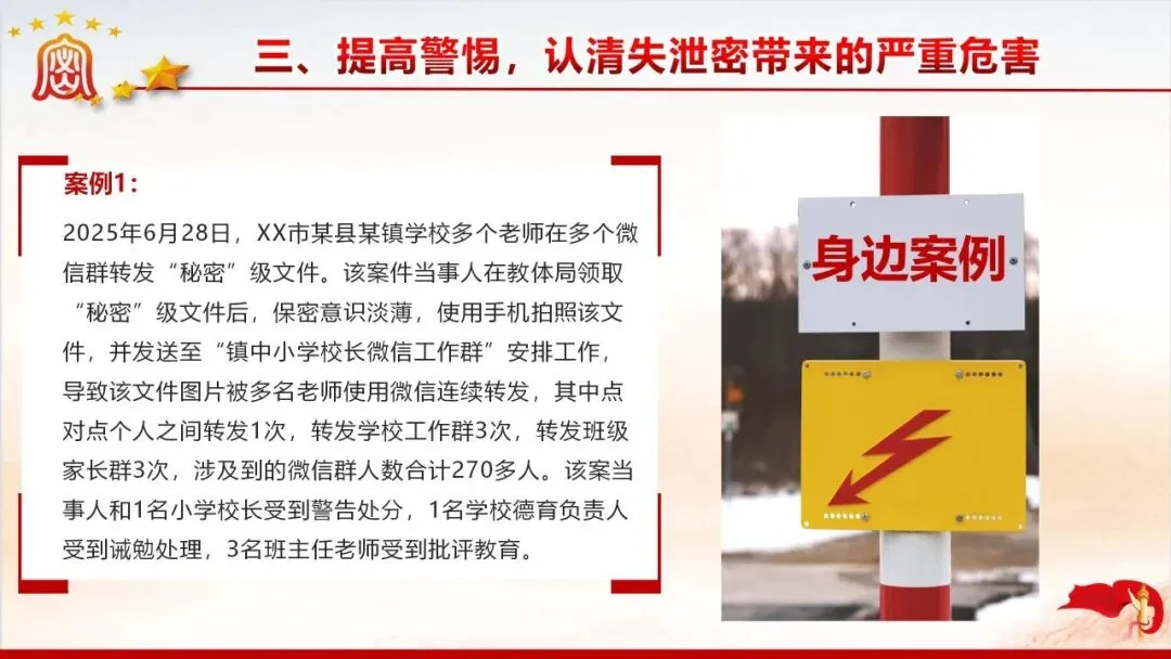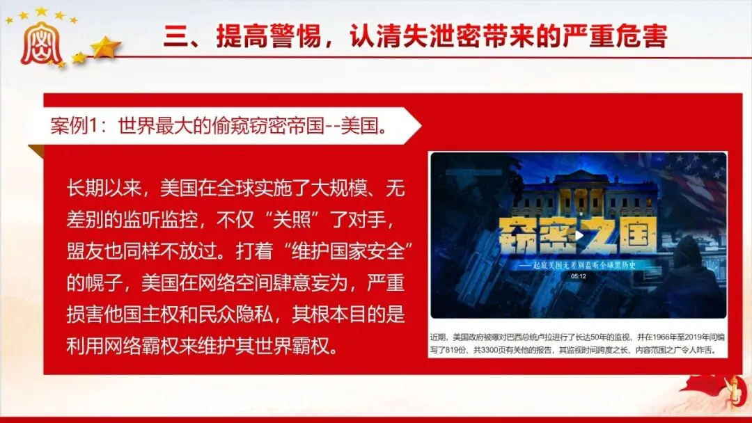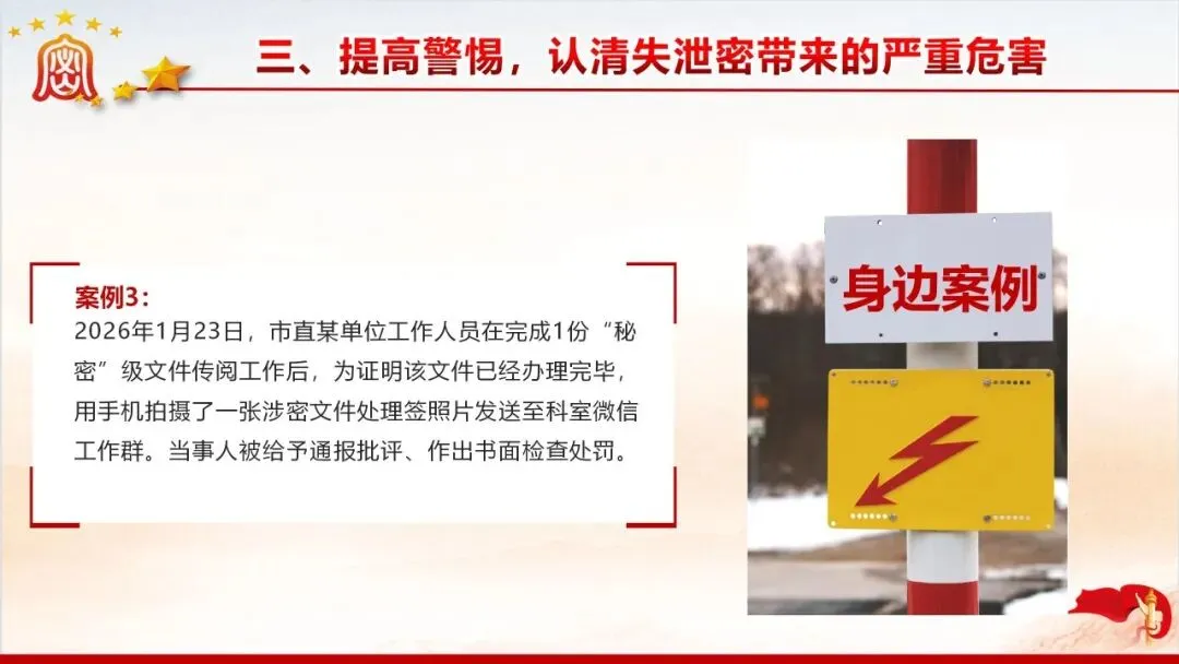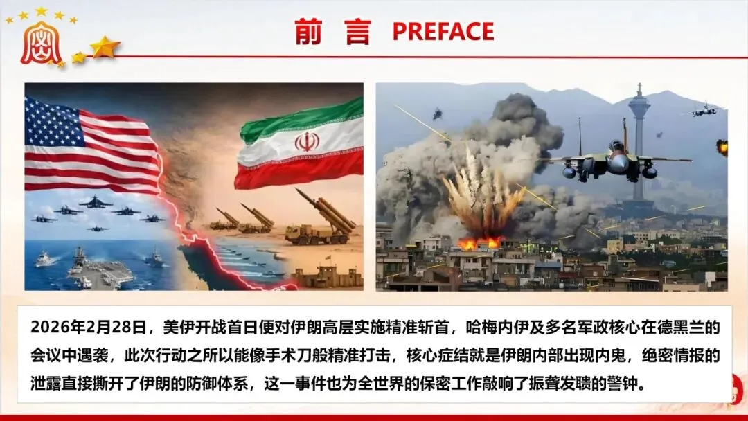 保密无小事,防线不容松。美伊战争中伊朗因内鬼泄密遭遇重创的案例,为我们敲响了保密工作的警钟。当前国际窃密与反窃密斗争日趋激烈,国内微信传涉密文件等失泄密问题频发,泄密隐患暗藏在工作生活的各个角落。新修订的《保密法》划定法治红线,这份保密教育资料以丰富案例剖析泄密危害,解读法规要求,指出日常工作中的保密风险,教你认清窃密手段、摒弃错误心理,筑牢思想和行动的保密防线,守护国家和单位秘密安全。