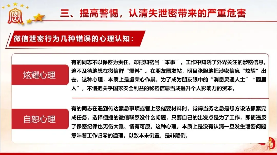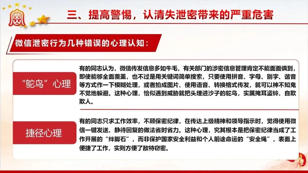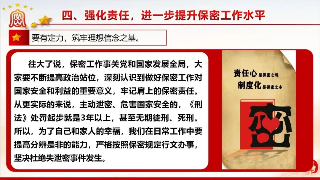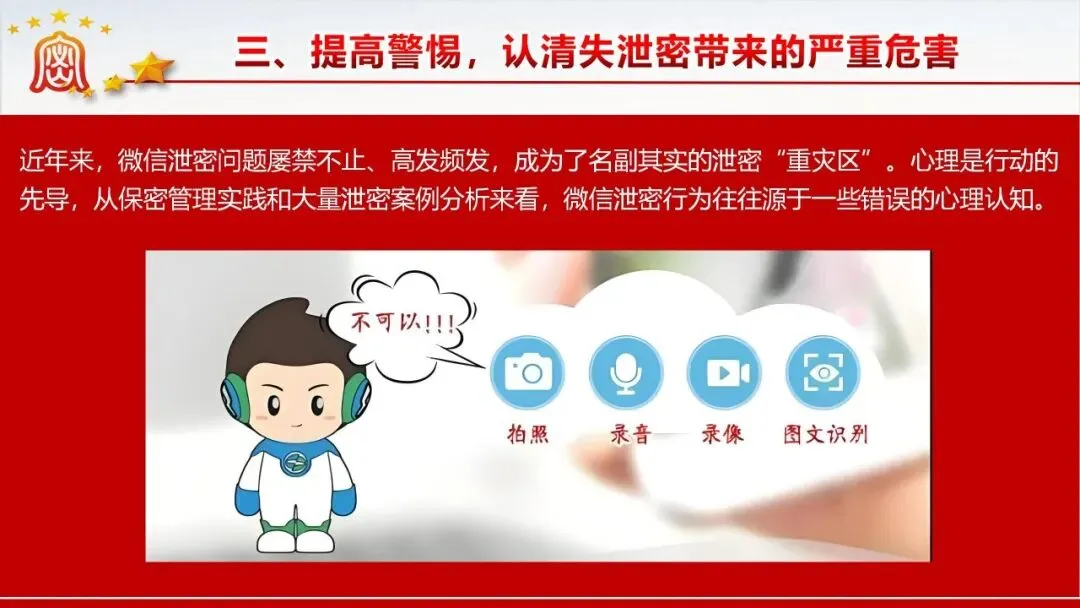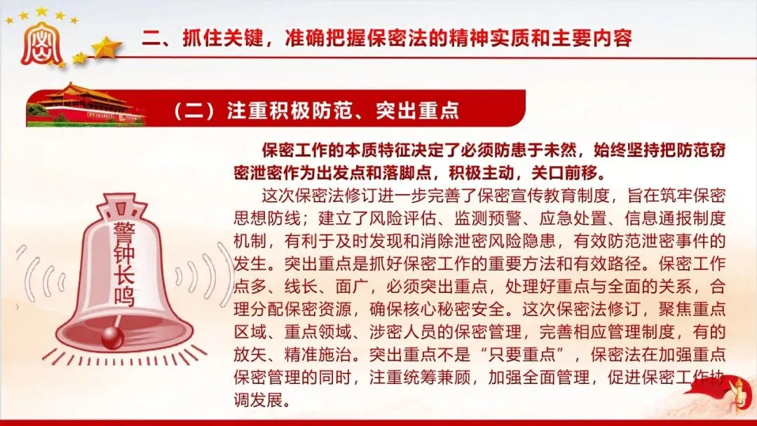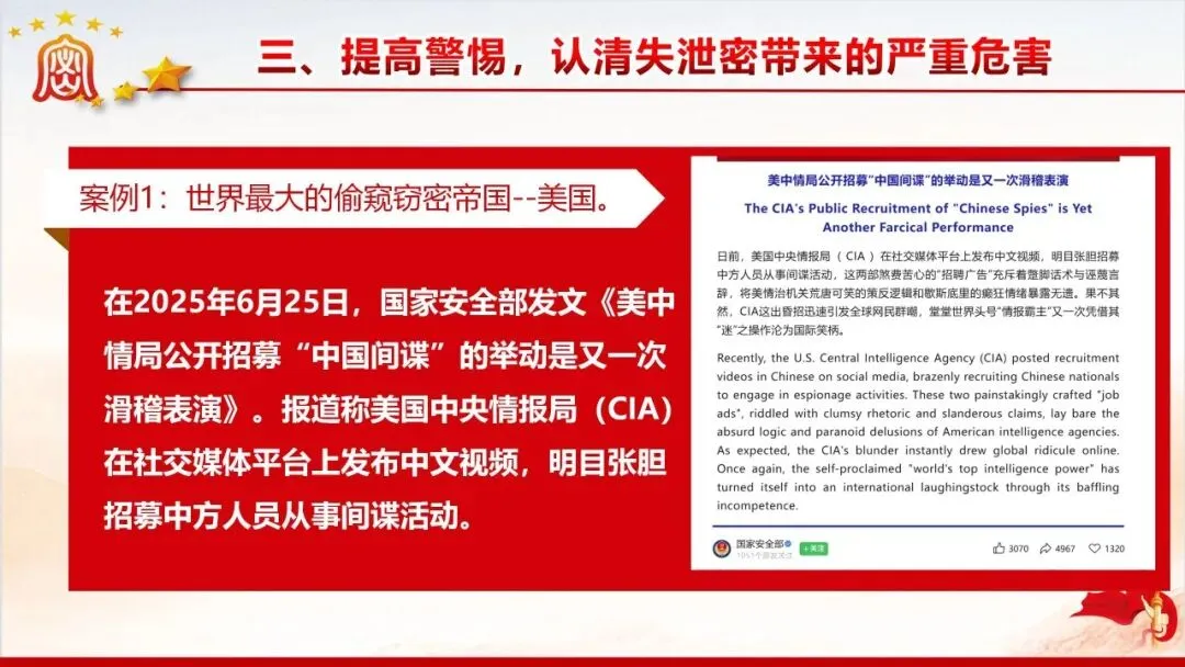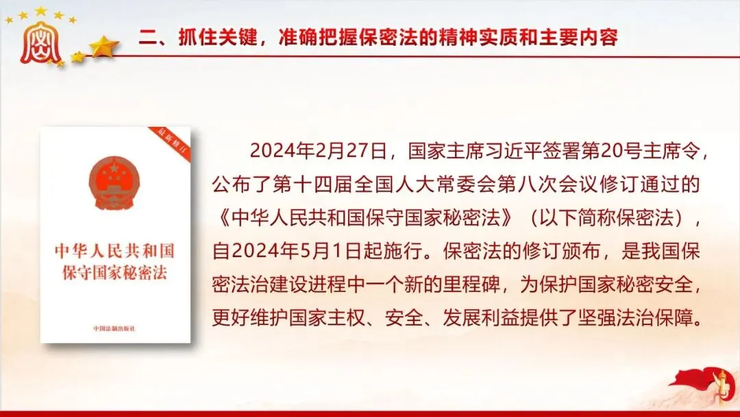 保密无小事,防线不容松。美伊战争中伊朗因内鬼泄密遭遇重创的案例,为我们敲响了保密工作的警钟。当前国际窃密与反窃密斗争日趋激烈,国内微信传涉密文件等失泄密问题频发,泄密隐患暗藏在工作生活的各个角落。新修订的《保密法》划定法治红线,这份保密教育资料以丰富案例剖析泄密危害,解读法规要求,指出日常工作中的保密风险,教你认清窃密手段、摒弃错误心理,筑牢思想和行动的保密防线,守护国家和单位秘密安全。