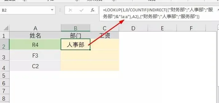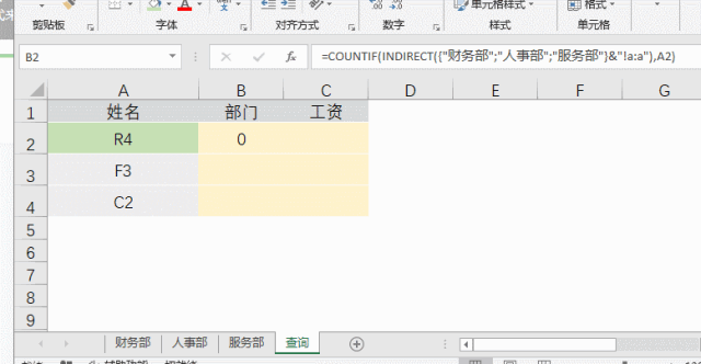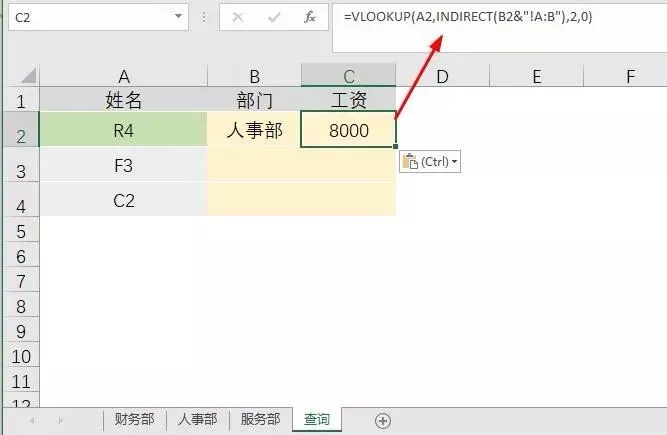 有了部门之后,再查工资,就很简单了,使用Vlookup配合indirect函数即可搞定!