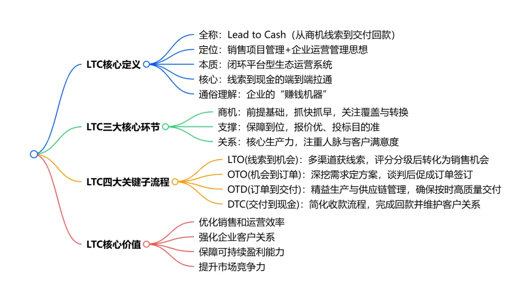 - LTC(Lead to Cash) 兼具销售项目管理属性与企业运营管理思想,是覆盖市场、线索、销售、项目、交付、现金、服务全链路的闭环平台型生态运营系统,核心是实现从销售线索到现金收回的端到端拉通,并非单一销售流程,而是集成了多流程组、流程和子流程的业务体系。