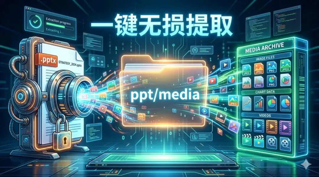 很多时候,咱们不是为了改 PPT,而是眼馋别人 PPT 里的高清大图、甚至里面内嵌的演示视频。如果右键保存,不仅慢,有时候还会被压缩画质。