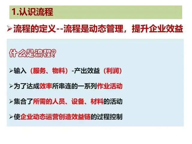 >输入(服务、物料)-产出效益(利润)为了达成效率所串连的一系列作业活动集合了所需的人员、设备、材料的活动>使企业动态运营创造效益链的过程控制