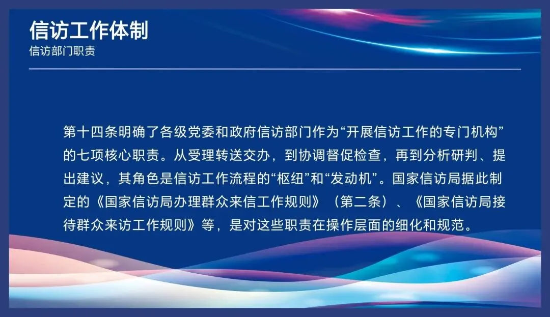 第十四条明确了各级党委和政府信访部门作为“开展信访工作的专门机构”的七项核心职责。从受理转送交办,到协调督促检查,再到分析研判、提出建议,其角色是信访工作流程的“枢纽”和“发动机”。国家信访局据此制定的《国家信访局办理群众来信工作规则》(第二条)、《国家信访局接待群众来访工作规则》等,是对这些职责在操作层面的细化和规范。同时,信访部门还需承担指导其他机关单位信访工作的职责,这要求其必须具备较高的专业水平和政策把握能力。
