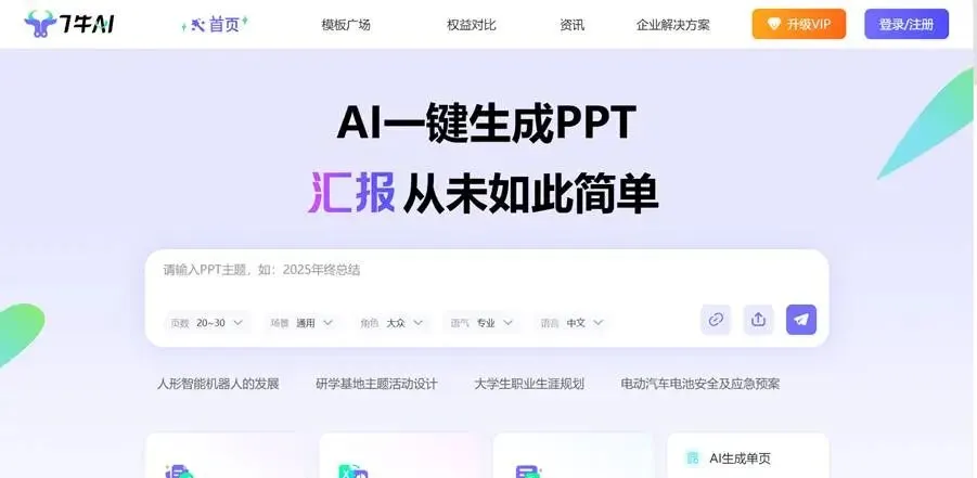 在众多AI PPT工具中,7牛AI PPT凭借其独特的优势脱颖而出。作为一名深度使用过多种AI工具的职场人,我可以负责任地告诉你,这款工具在以下几个方面表现尤为出色,特别适合中国用户和零基础的新手朋友。