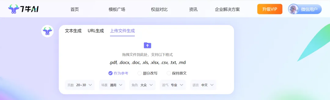 在实际工作中,我们的素材来源多种多样:可能是Word文档、Excel表格、PDF报告,甚至是网页链接。7牛AI PPT支持几乎所有常见格式的导入,包括.docx、.txt、.pdf、.xmind等,最大支持10MB的Word文档和30MB的PDF文件,字数上限高达20万字。