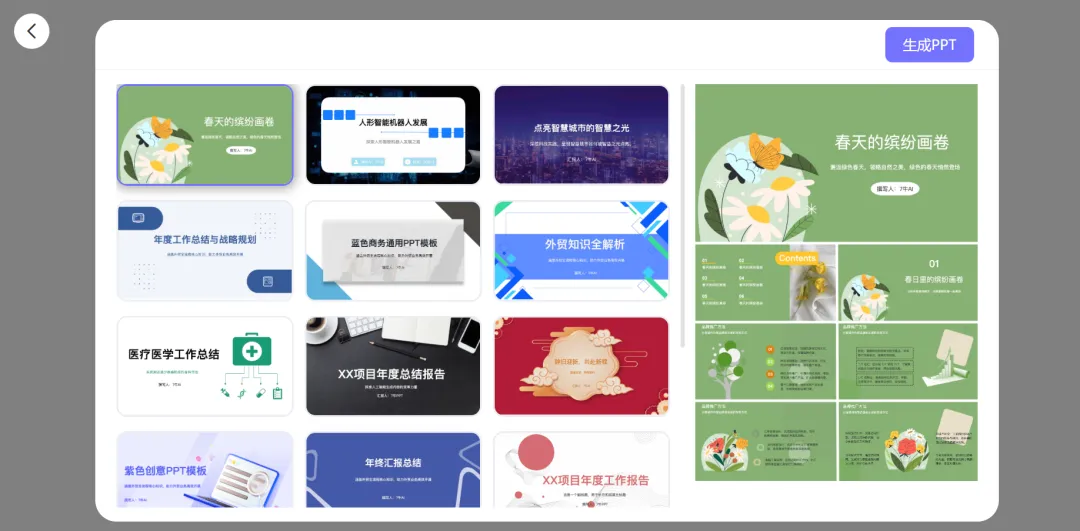 系统会根据内容推荐3-5个合适模板,你也可以手动浏览模板库,搜索关键词如"商务"、"科技"、"简约"等。点击模板可以预览效果,选择最符合需求的一款。模板的选择直接影响PPT的视觉效果,建议根据受众和场合谨慎选择。