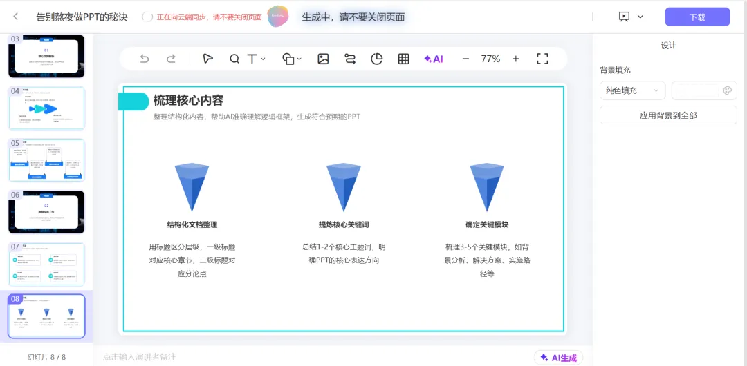 点击"生成PPT"按钮,等待10-30秒,系统自动完成所有排版、配图、图表生成工作。生成后自动进入在线编辑器,你可以进一步调整细节。整个过程无需任何设计技能,AI会自动处理所有技术性问题。