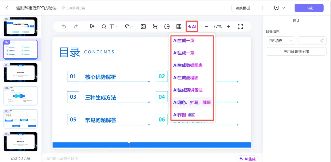 点击右上角"美化"按钮,系统自动统一字体、配色、排版,让PPT整体风格更加协调。如果你对配色不满意,可以手动调整主题色,系统会自动应用到所有页面。